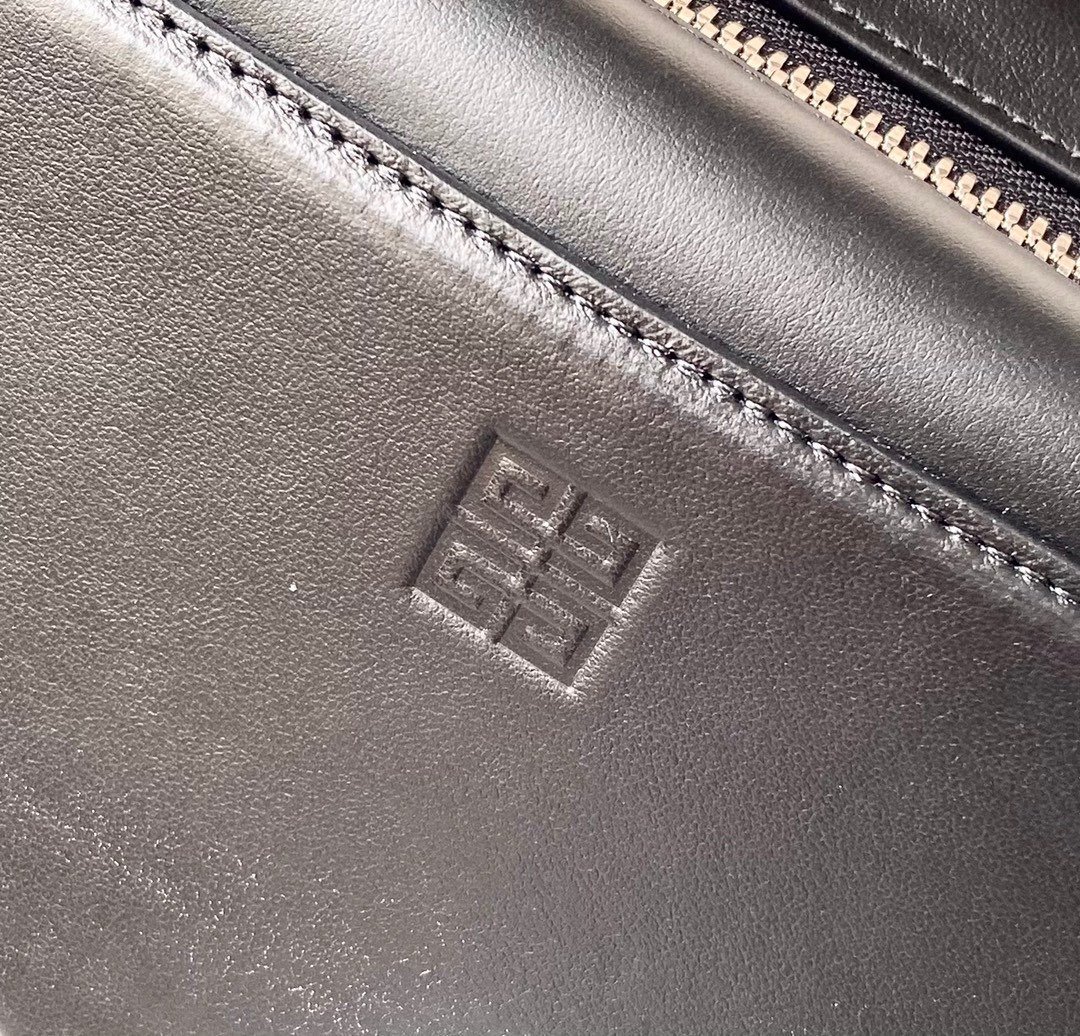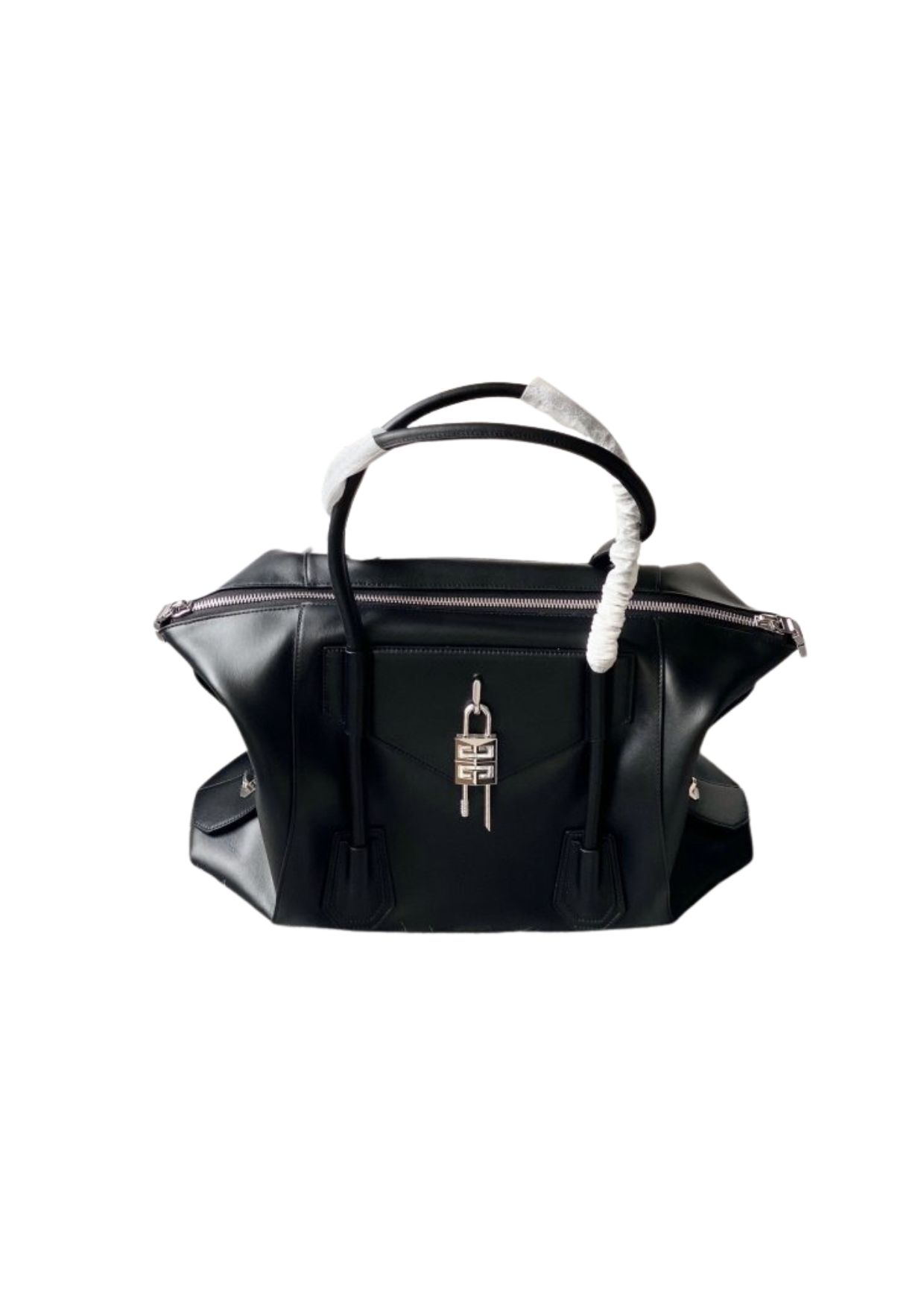 Small Antigona Soft bag in soft pearl with pentagonal GIVENCHY patch, dark silver-finish metal details and side bands with a twist clasp. Adjustable and removable shoulder strap. One main compartment, one flat pocket, and one pocket for business cards on the inside.