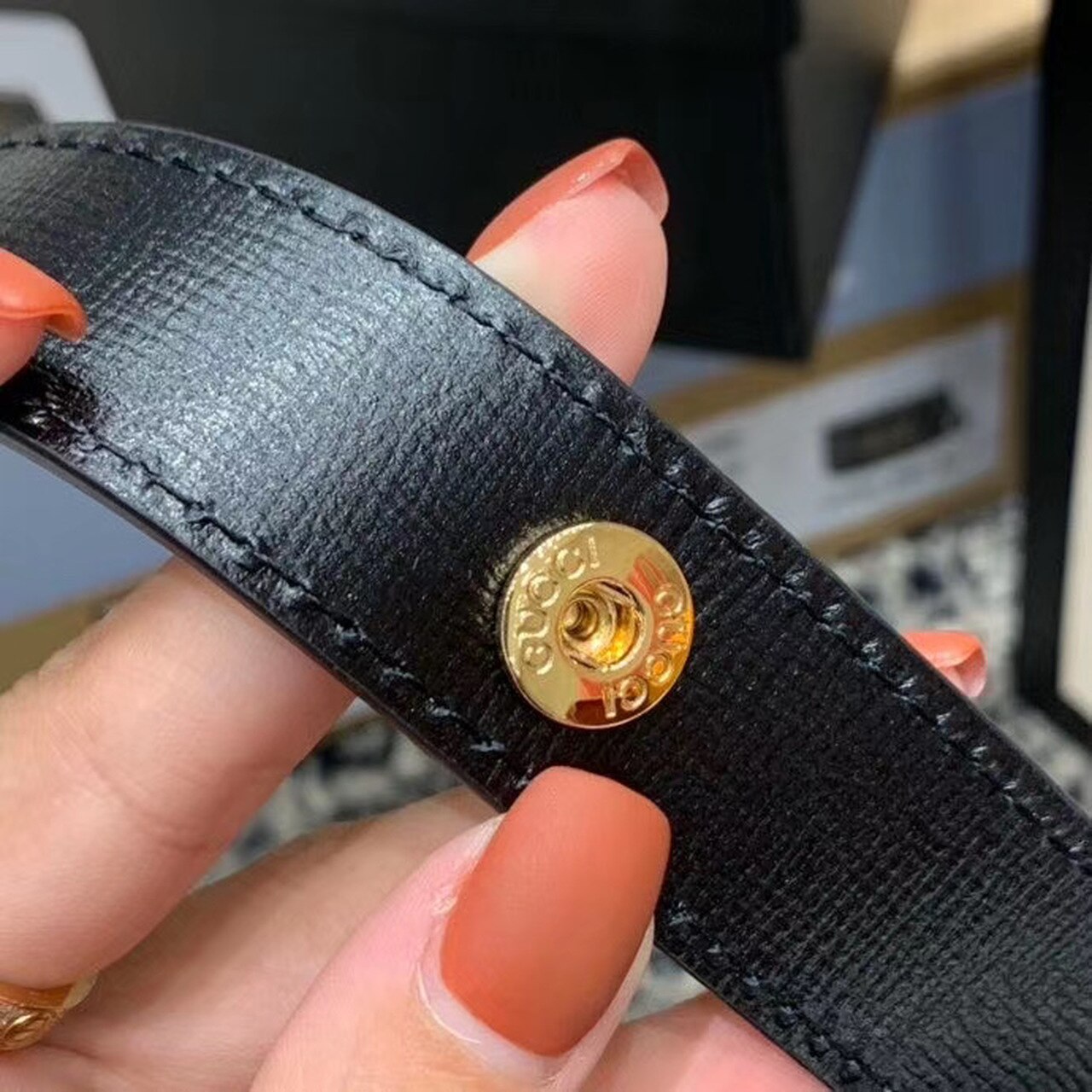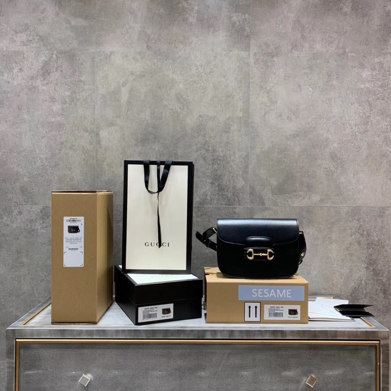 Gold-toned hardware.