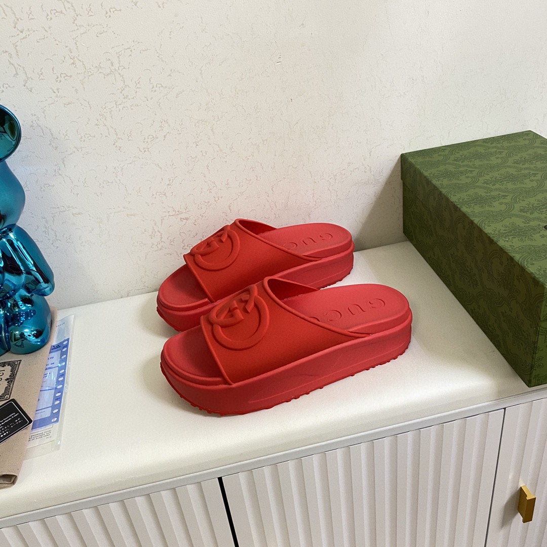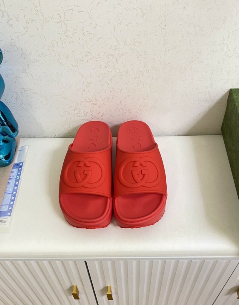 Influenced by an archival design from the '70s-a hallmark era of the House, the Interlocking G appears as an embossed detail atop this Red rubber sandal. An ode to timeless elegance, this latest Gucci collection explores archival symbols in new ways