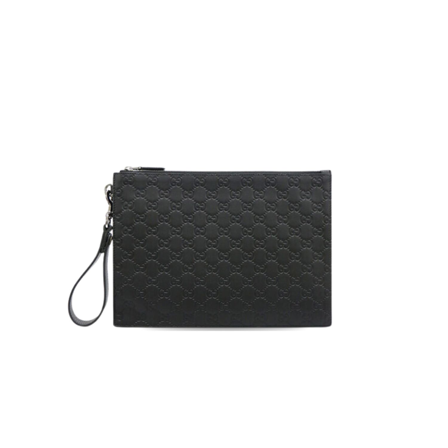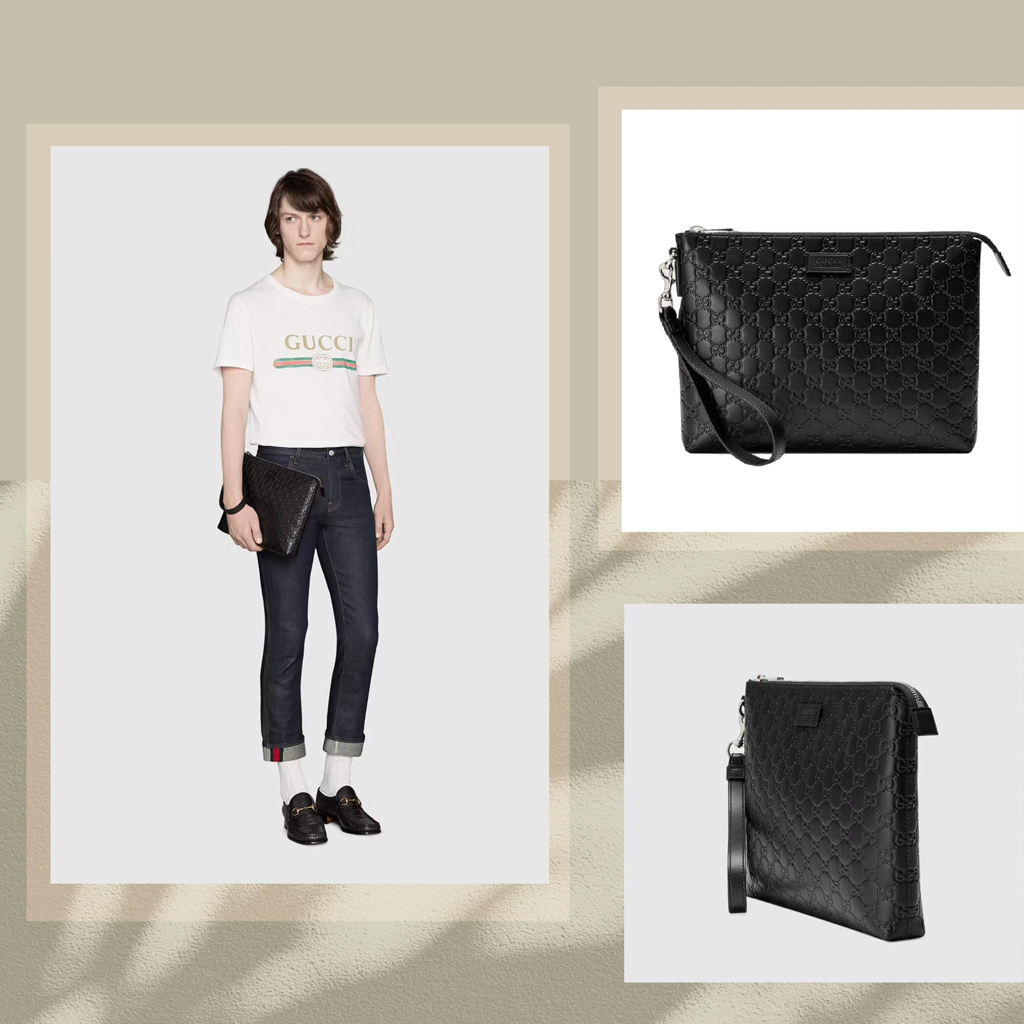 The zippered pouch is presented in beige and ebony GG wool a contemporary interpretation of the original 1930s design, the distinctive fabric is displayed throughout the Cruise 2020 ready-to-wear and accessories. Trimmed with textured black leather, the design comes with a removable strap that secures around the wrist.