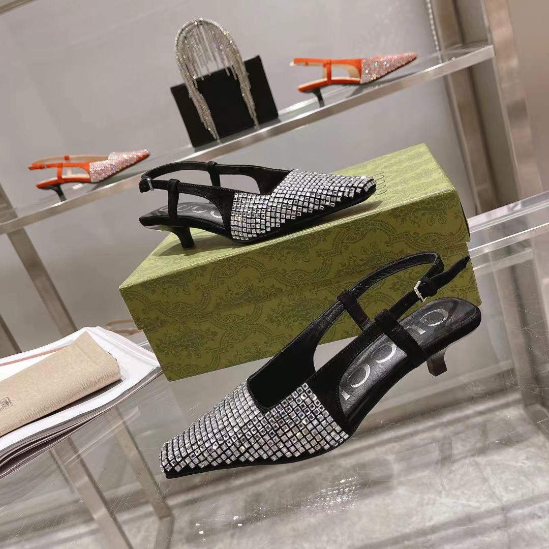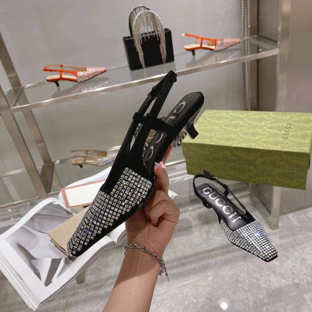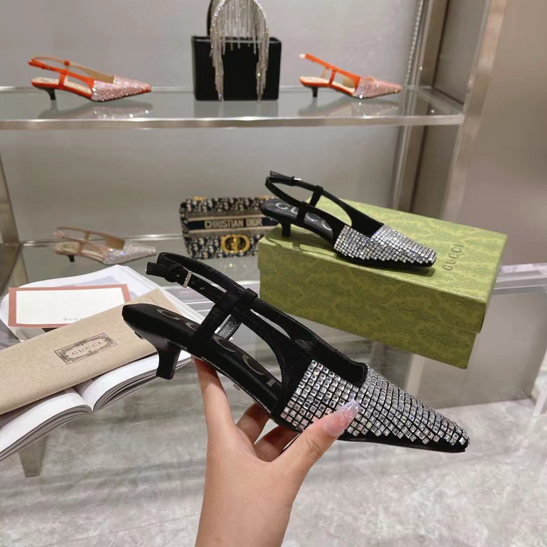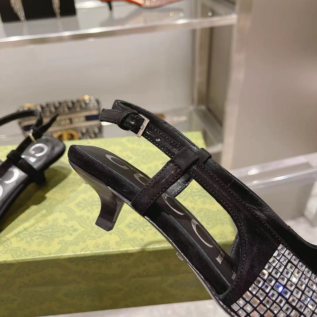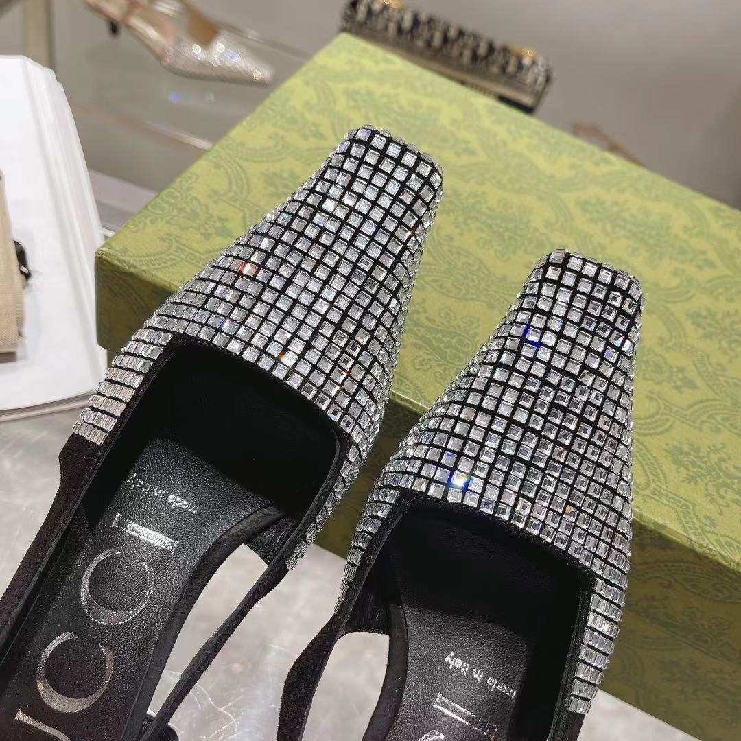 The Gucci Aria collection takes references from the archives of the '90s and early '2000s, with pieces inspired from Tom Ford's era in Gucci. The new idea of femininity shows glamorous details, such as lace, crystals and sheer fabrics. This pair of slingback shoes are presented in Black canvas with a sparkling GG motif.