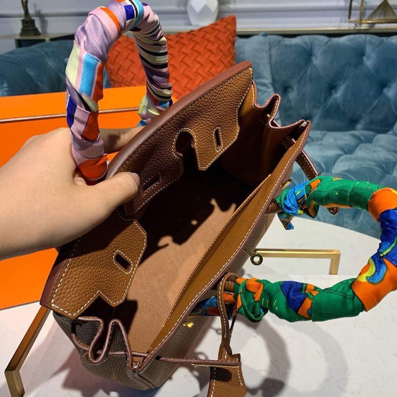 Brown Large compartment Handle: Double Gold toned hardware Chevre lining with one side zippered pocket.