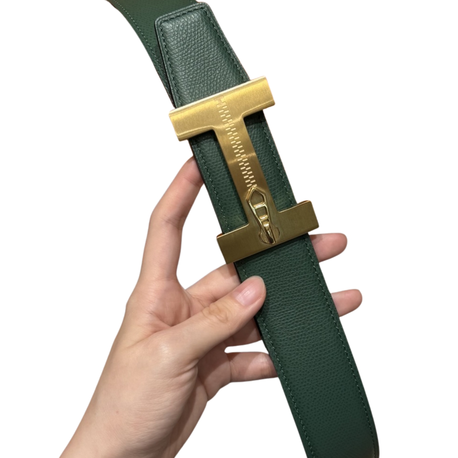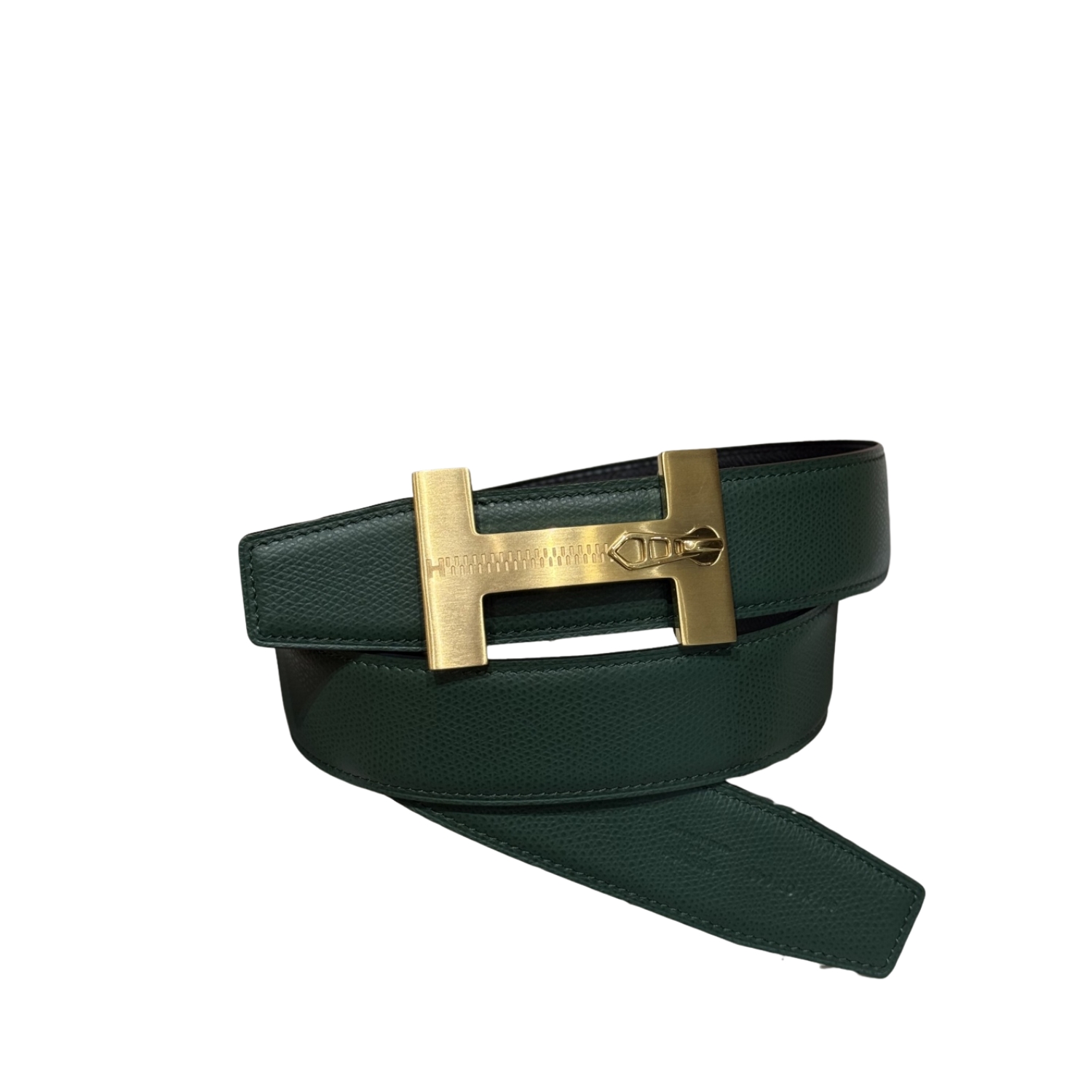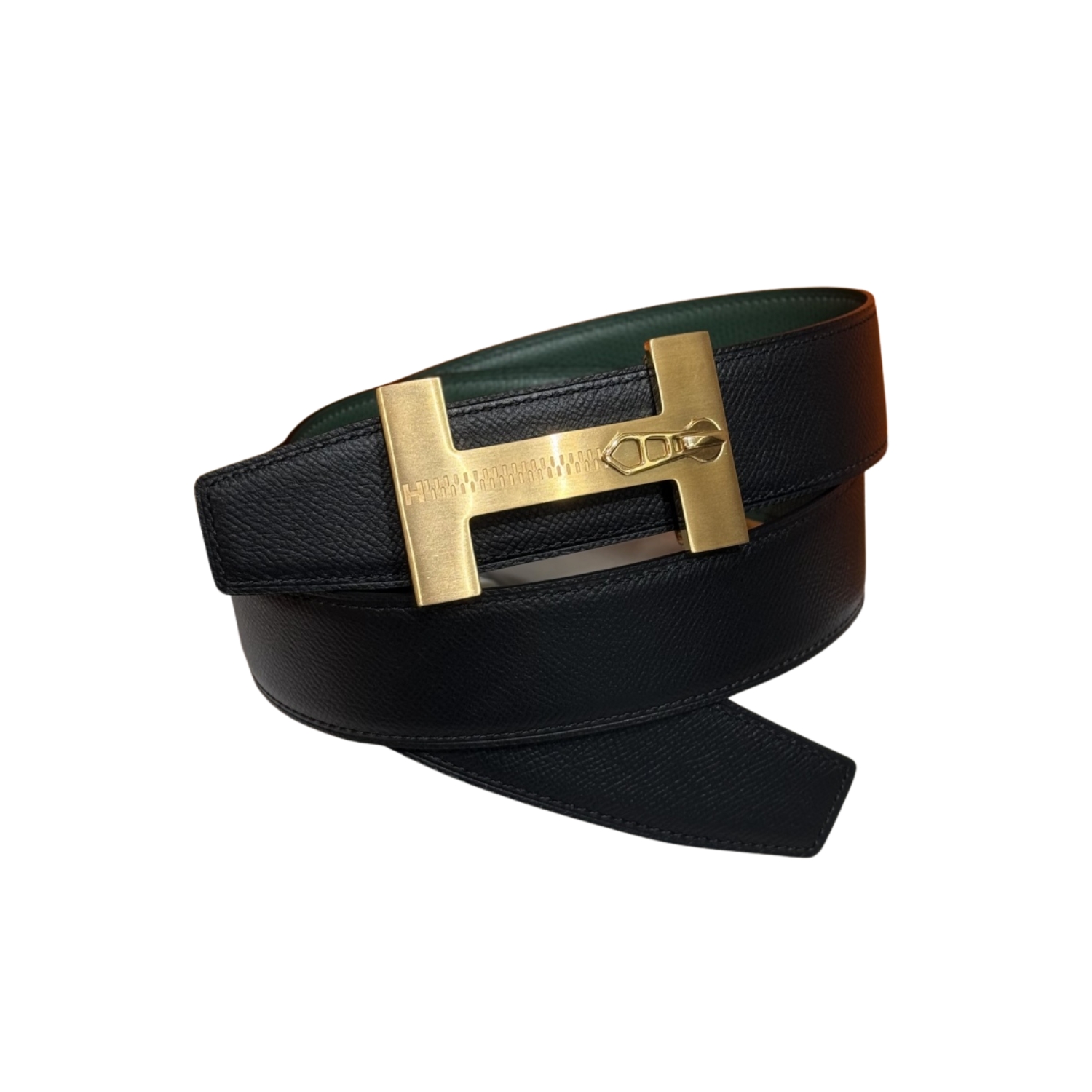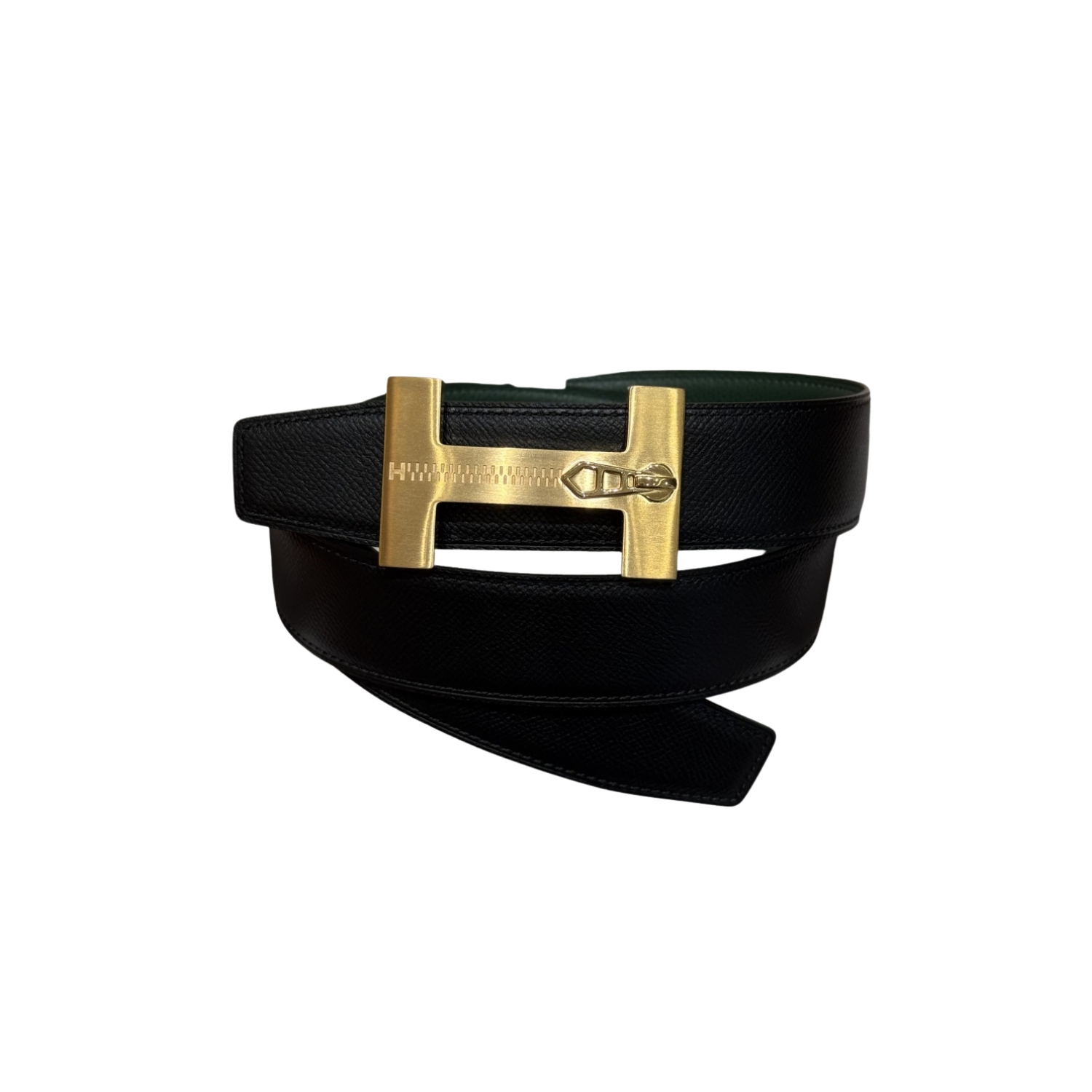 A refined take on Hermès' iconic “H” belt, this piece stands out with its zipper-inspired buckle detail in brushed gold, it features a reversible design: classic black on one side, and rich green on the other.