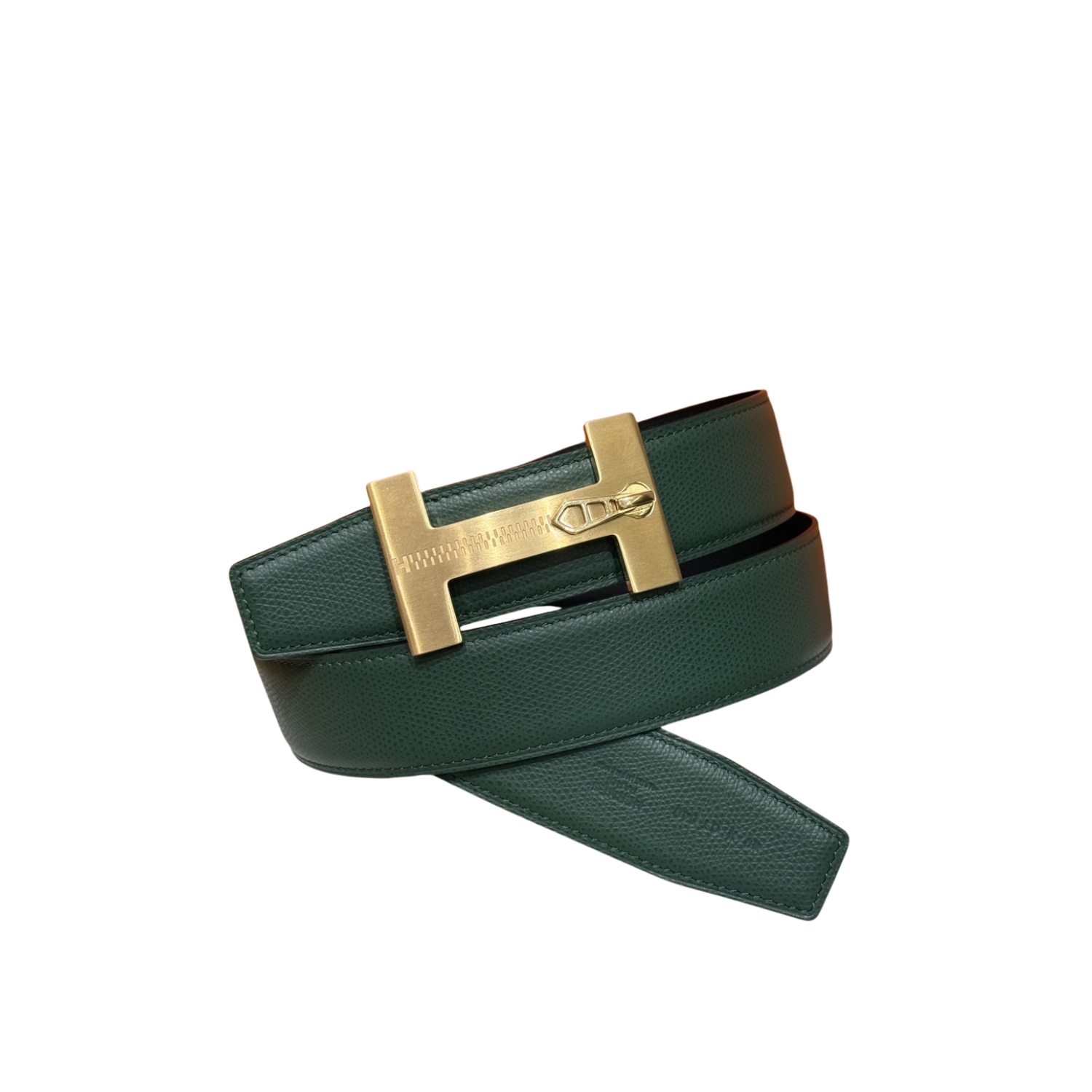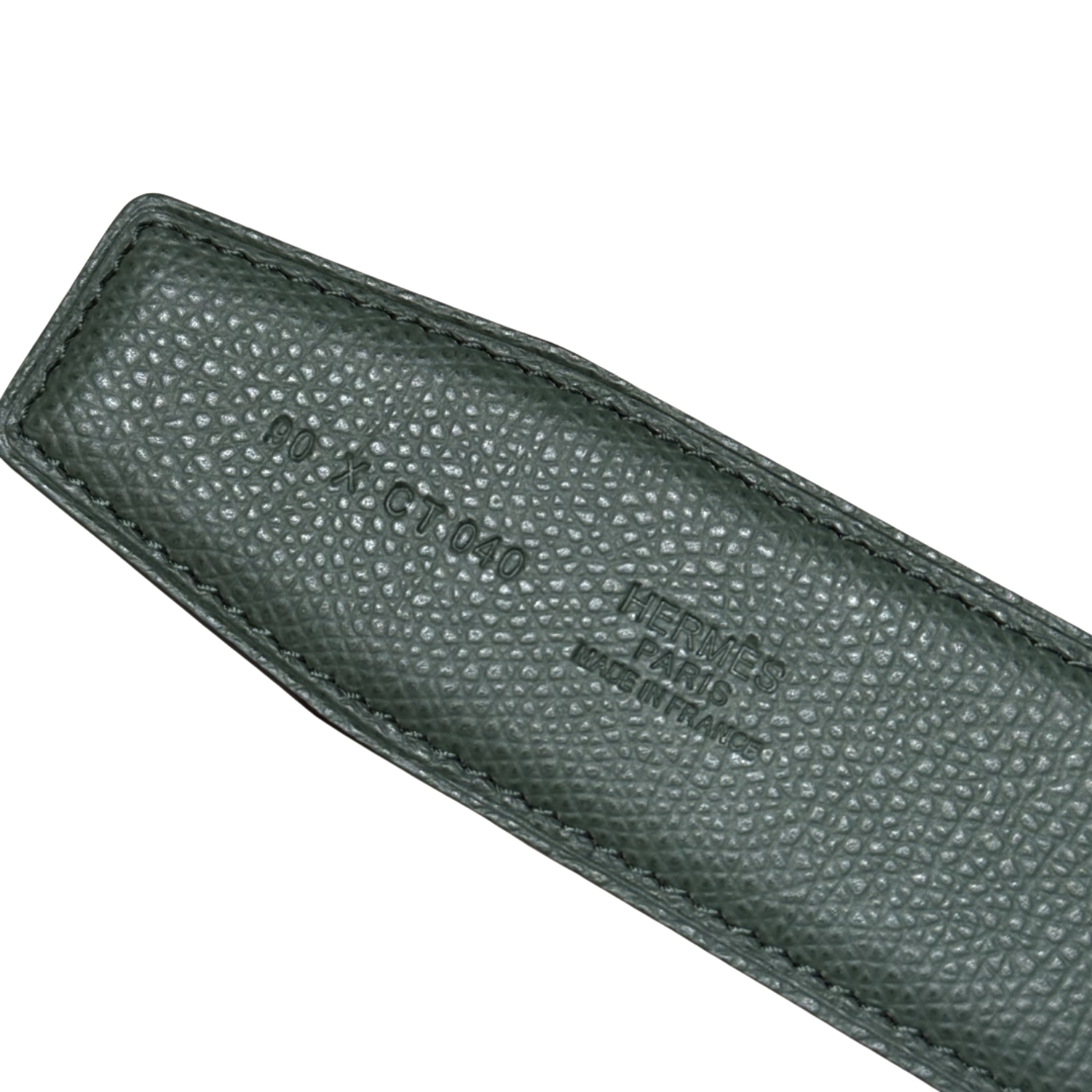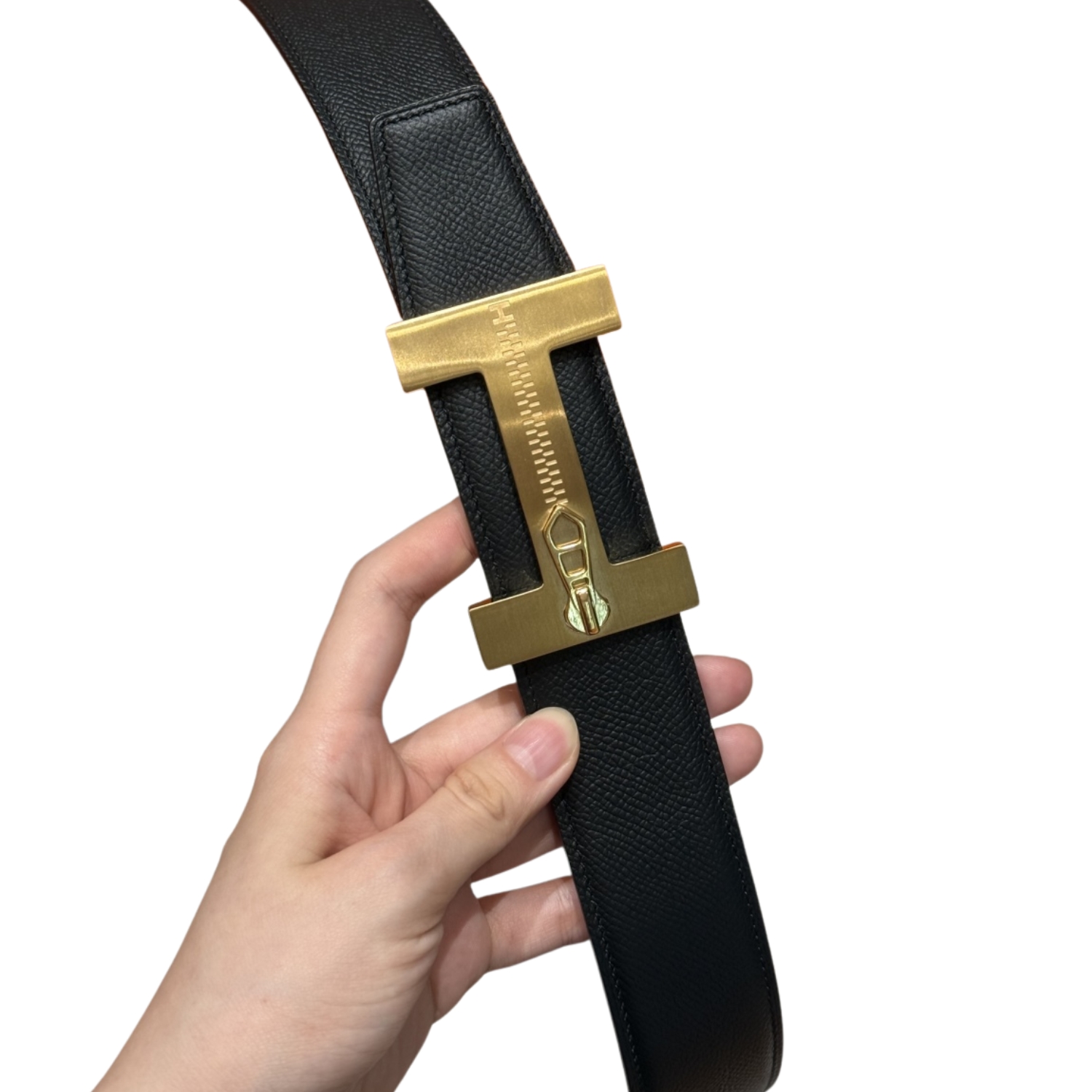 A refined take on Hermès' iconic “H” belt, this piece stands out with its zipper-inspired buckle detail in brushed gold, it features a reversible design: classic black on one side, and rich green on the other.