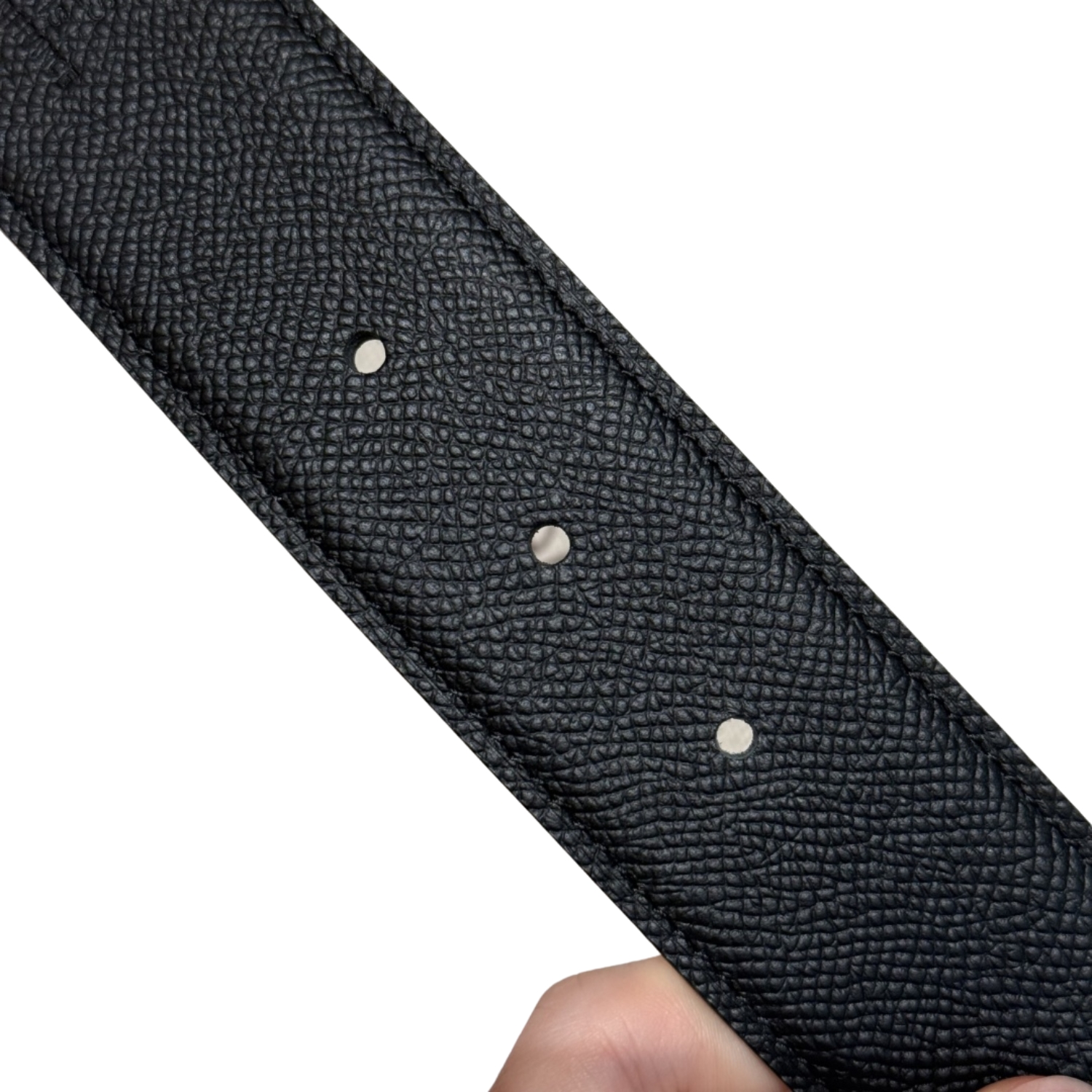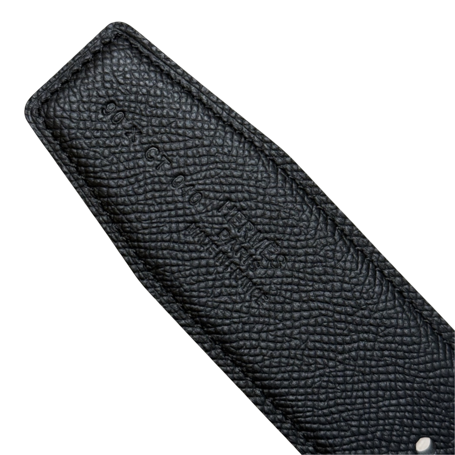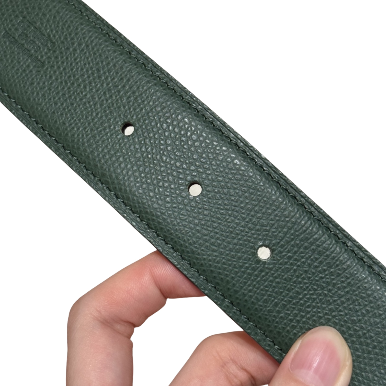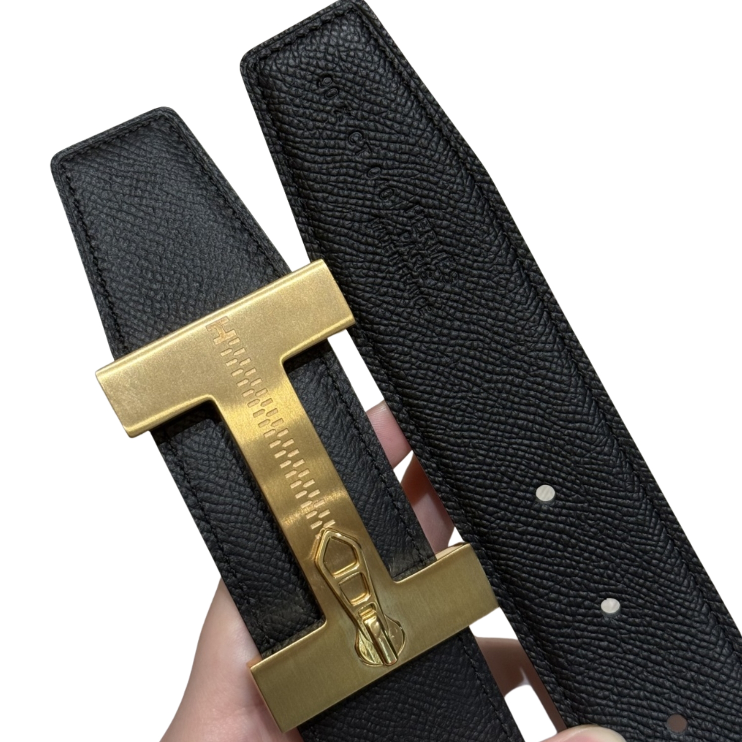 A refined take on Hermès' iconic “H” belt, this piece stands out with its zipper-inspired buckle detail in brushed gold, it features a reversible design: classic black on one side, and rich green on the other.