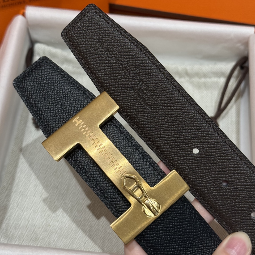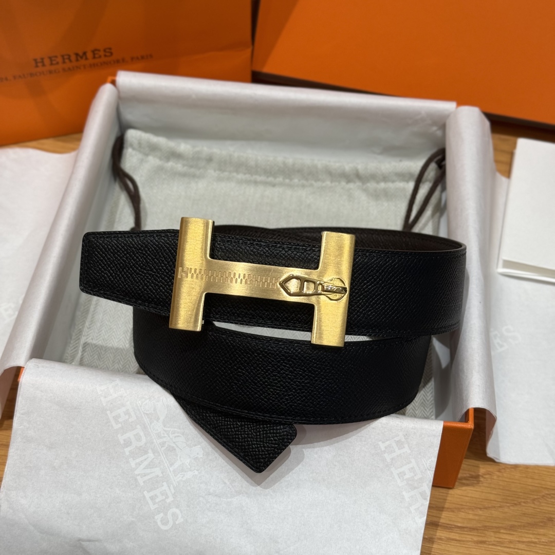 A refined take on Hermès' iconic “H” belt, this piece stands out with its zipper-inspired buckle detail in brushed gold, it features a reversible design: classic black on one side, and rich green on the other.