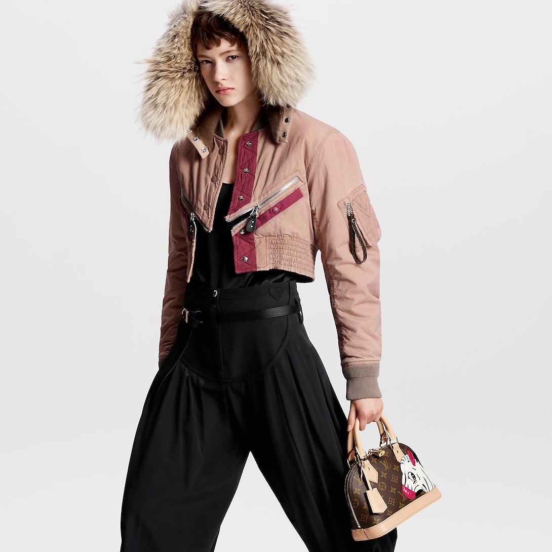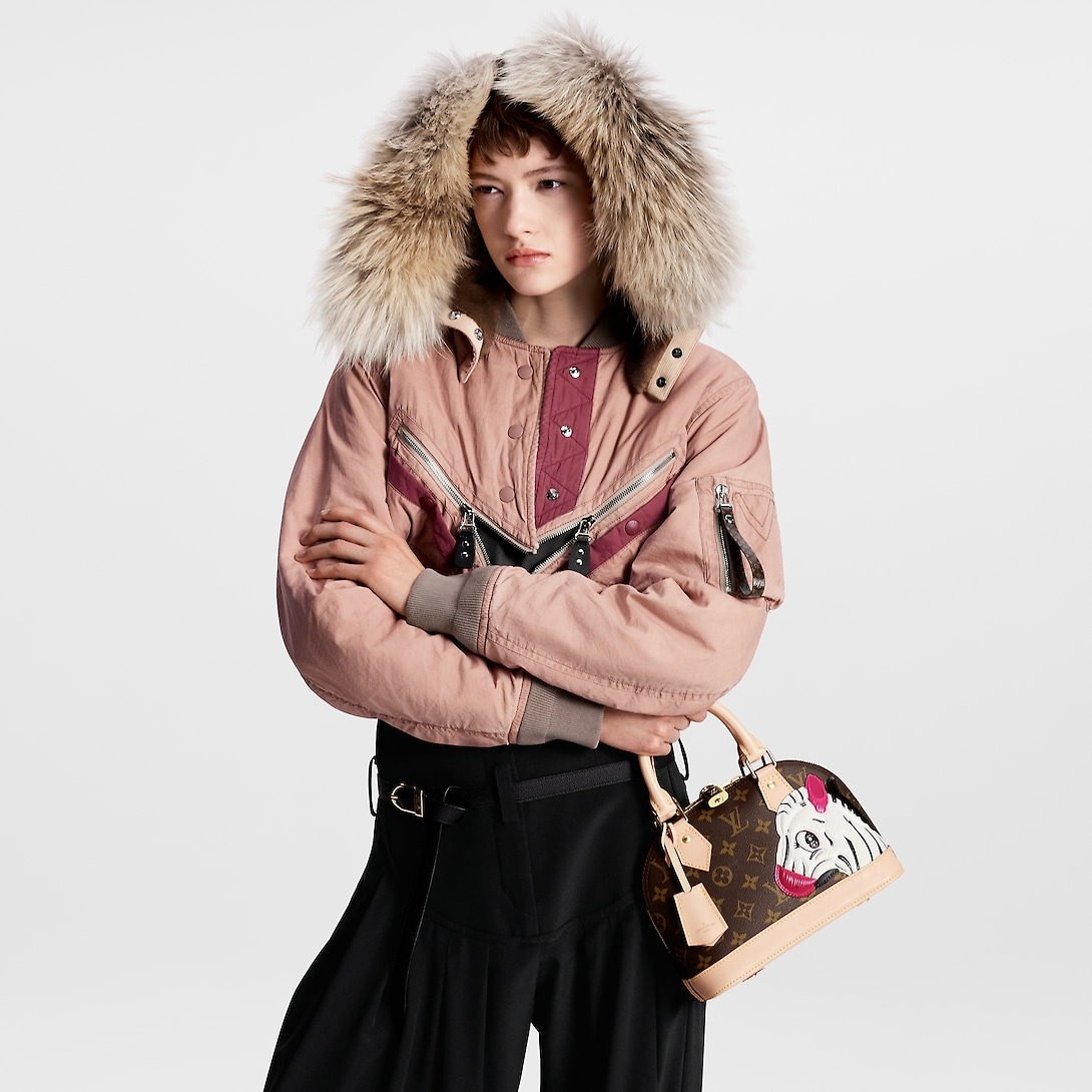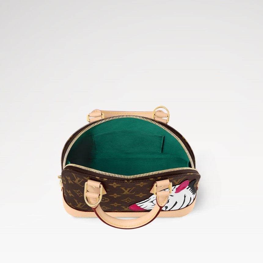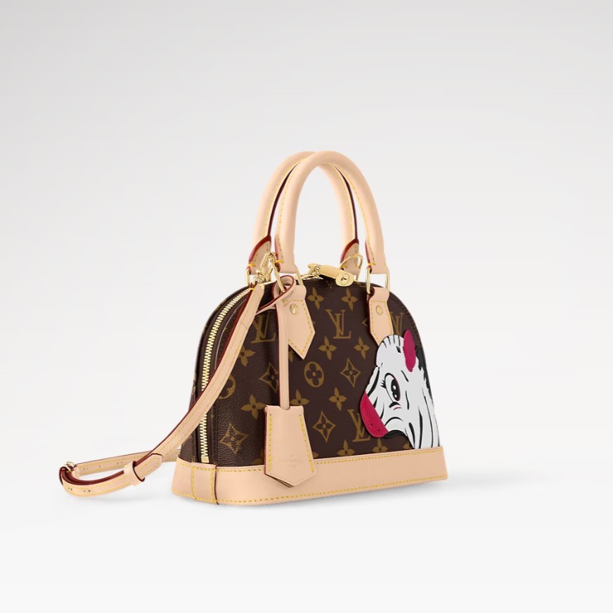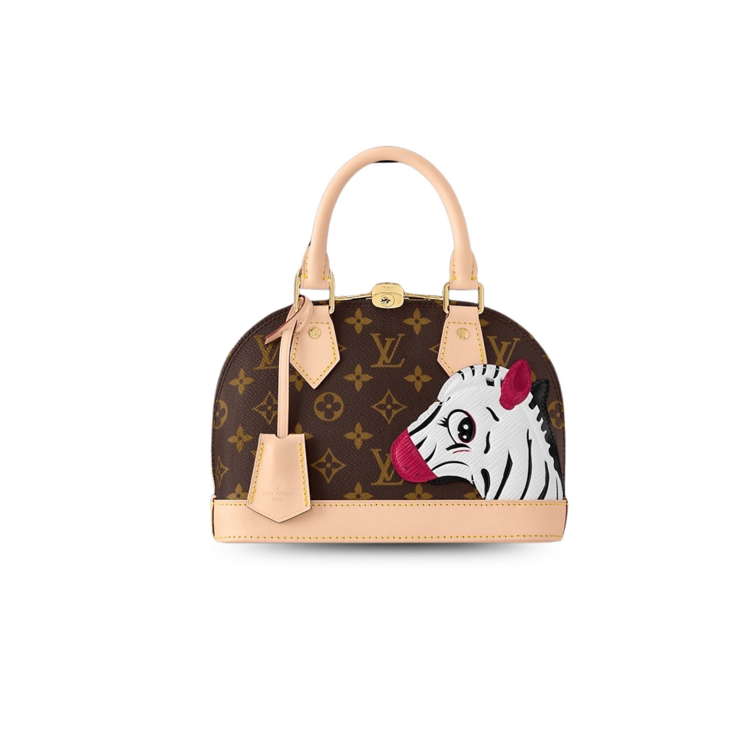 This Alma BB handbag is made from Monogram canvas with cowhide-leather trim. It features a zebra-head patch in Epi leather, co-created by Nicolas Ghesquière and Chinese artist Sun Yitian. The colors echo those of the background of the original artwork. The two rolled-leather top handles, and a removable and adjustable strap, give carry options.