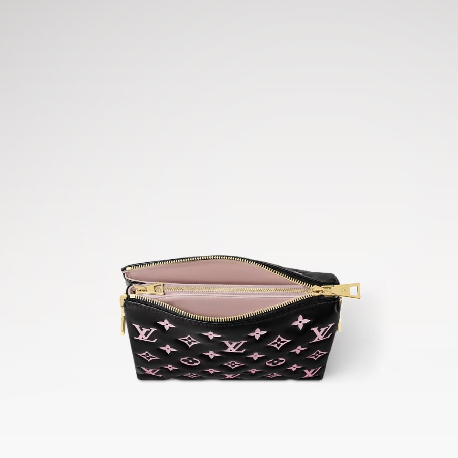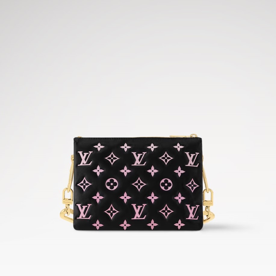 Designed for the LV Ski collection, this mountain-ready edition of the Coussin BB brings an elevated approach to aprés-ski dress codes. Showcasing a new gradient finish that matches the season’s Ready-To-Wear offering, it is crafted from lamb leather embossed with the House’s signature Monogram. The bi-galvanized chunky chain makes a bold statement, and can be removed if desired.