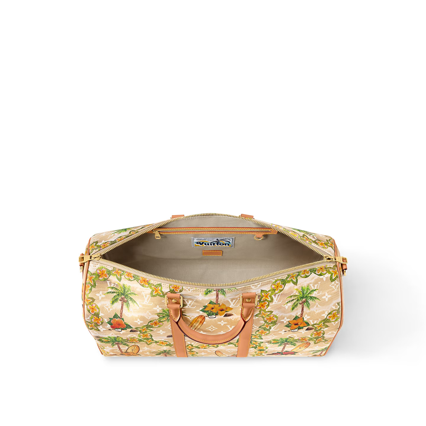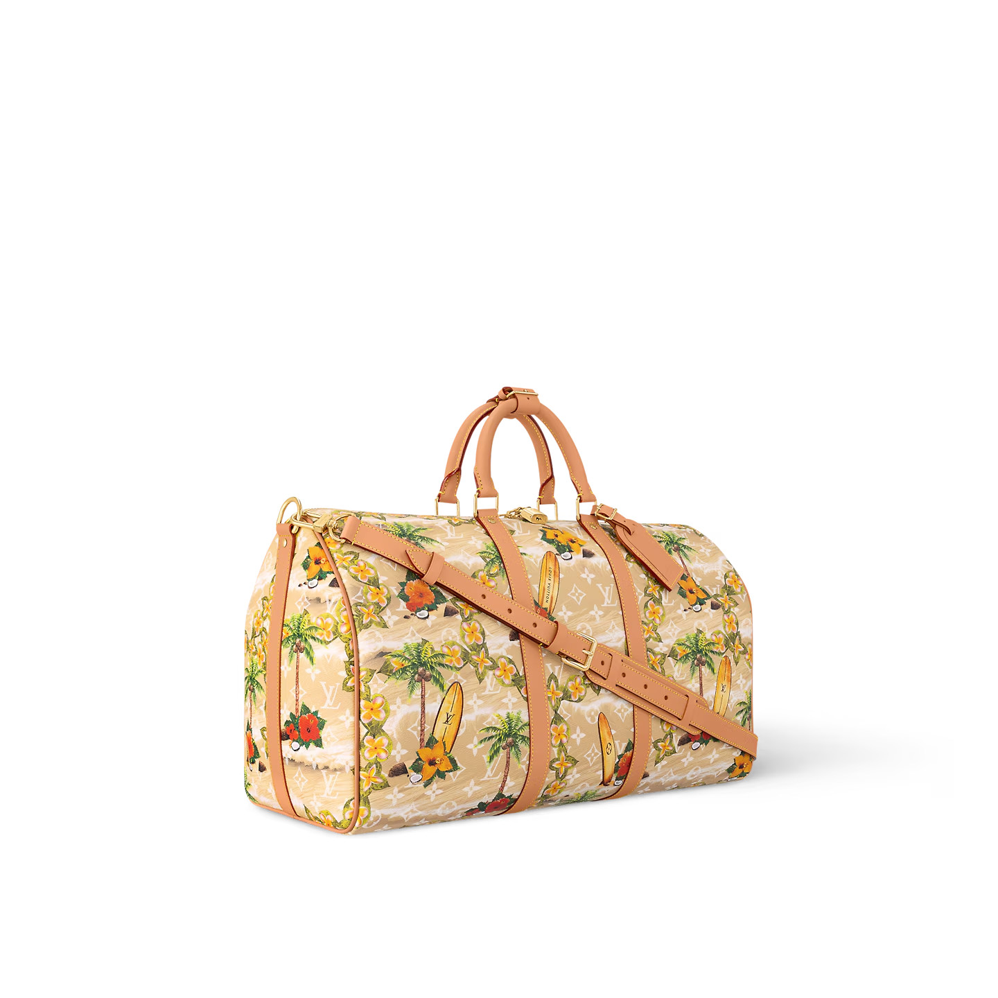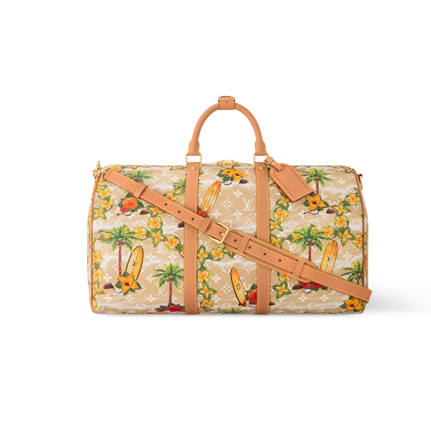 The classic Keepall Bandoulière 50 travel bag is eye-catching in Pharrell Williams’ Monogram Surfin’ coated canvas. The elaborate print juxtaposes vintage-style tropical motifs with classic House patterns like the Monogram Flowers.