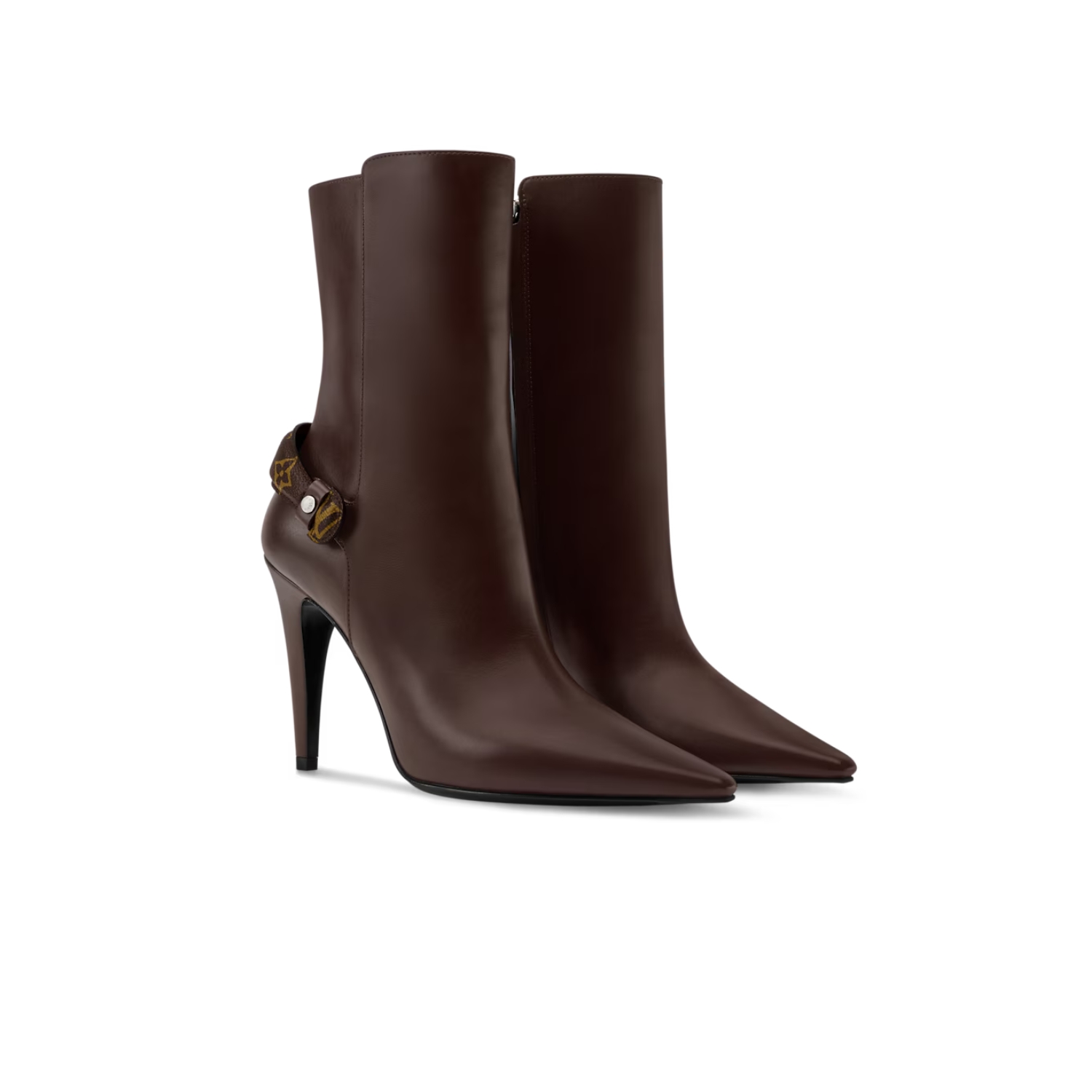 The Legacy ankle boot is characterized by its pointed toe and high stiletto heel, it is notable for the strap detail in Monogram canvas at the back, which references the handles of Louis Vuitton trunks.