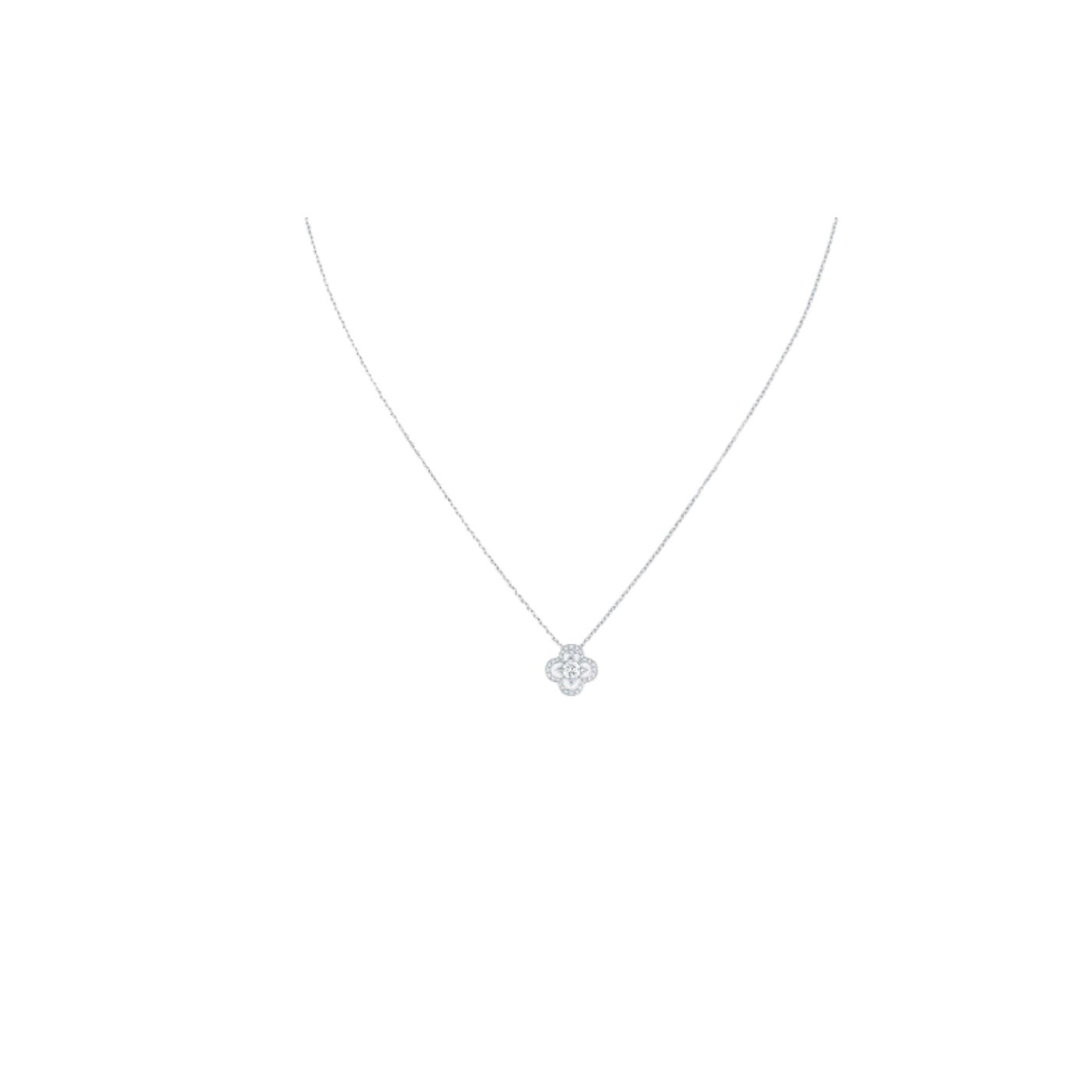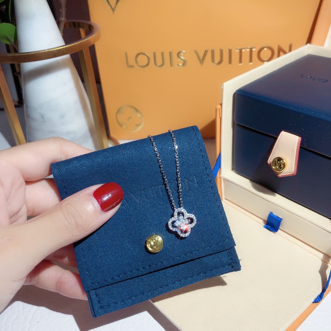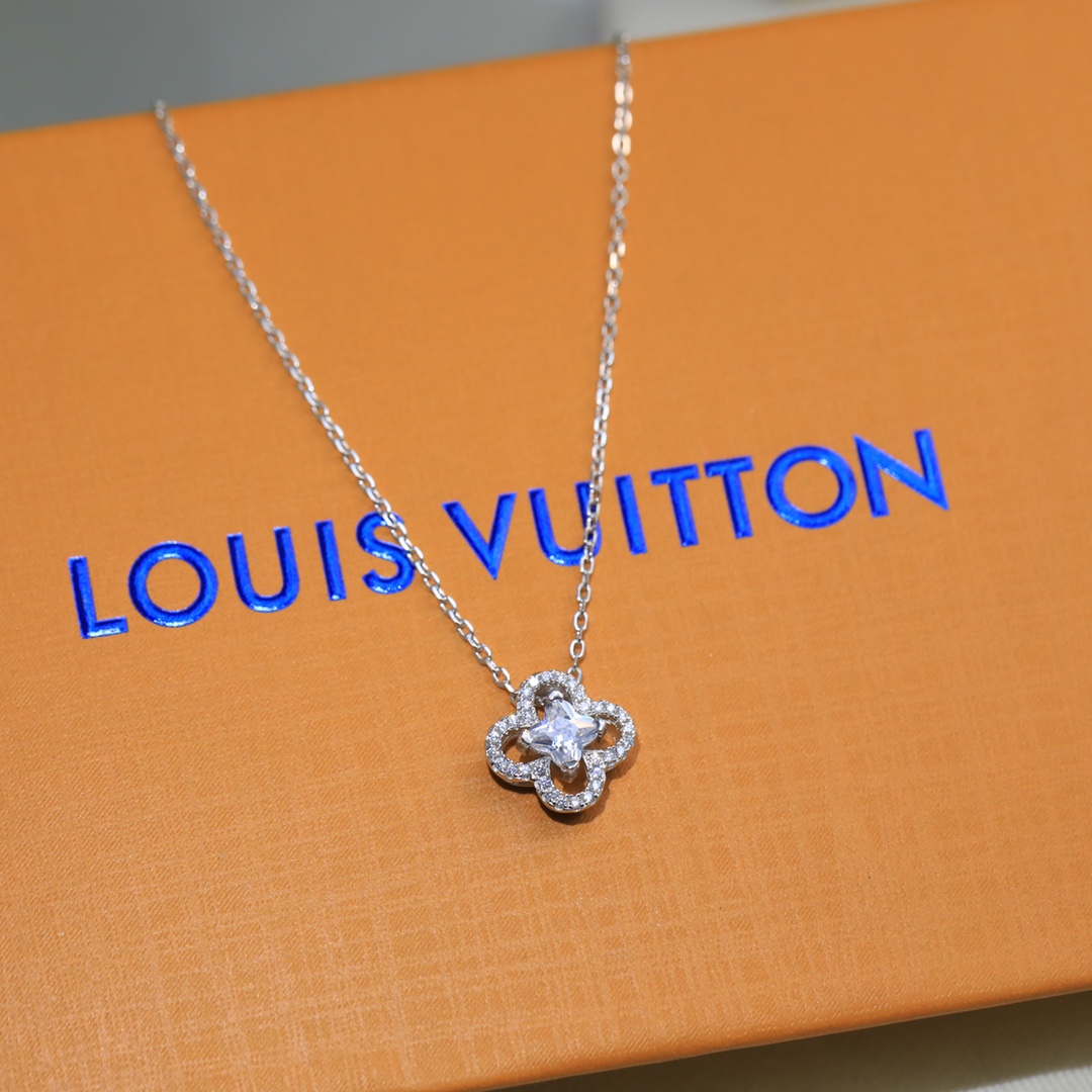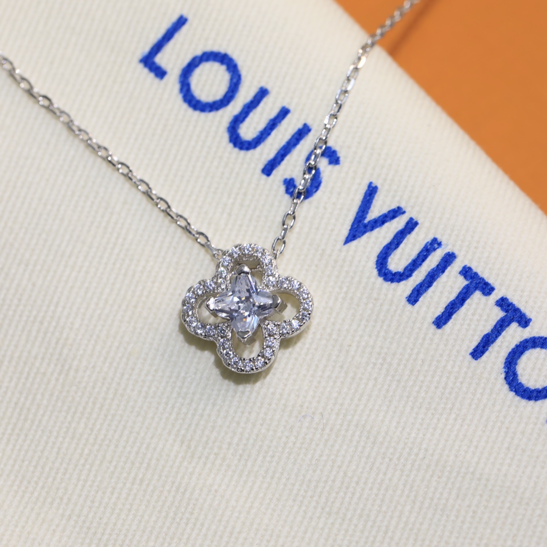 LV necklace Silver tone hardware Four petals flower pendant Attach sparkling stone on pendant