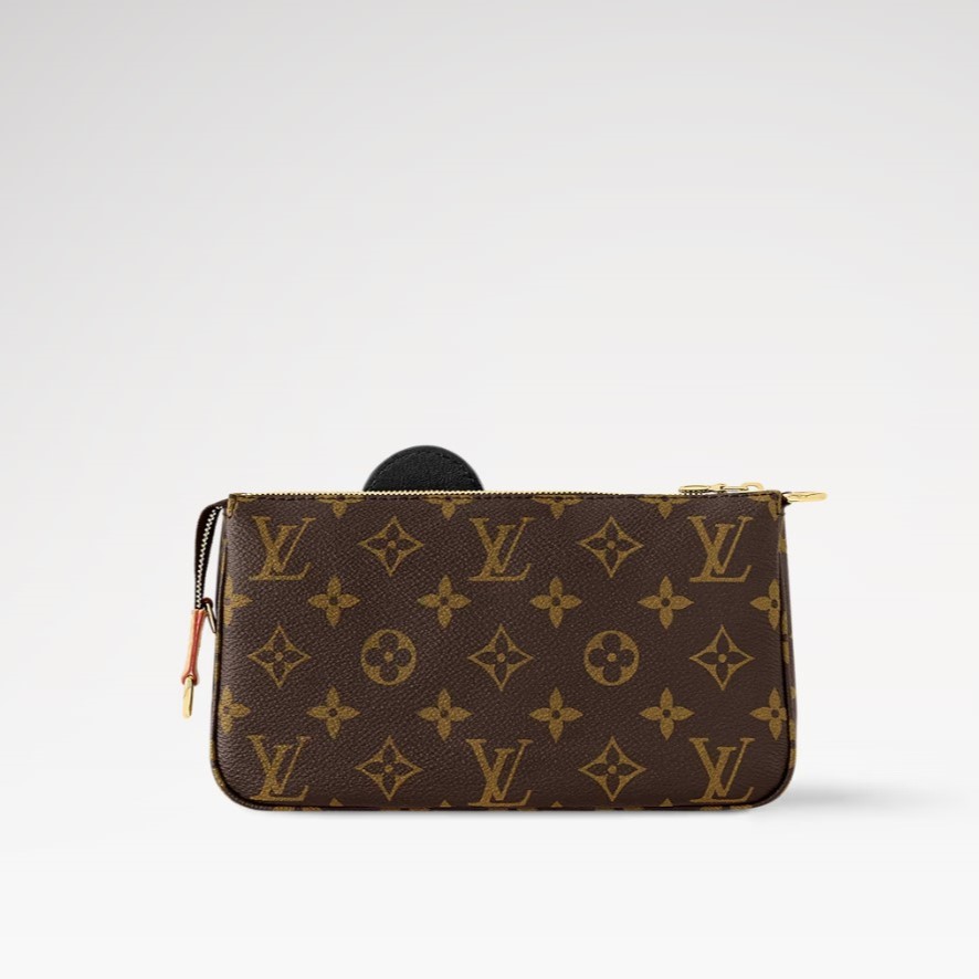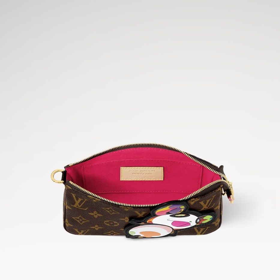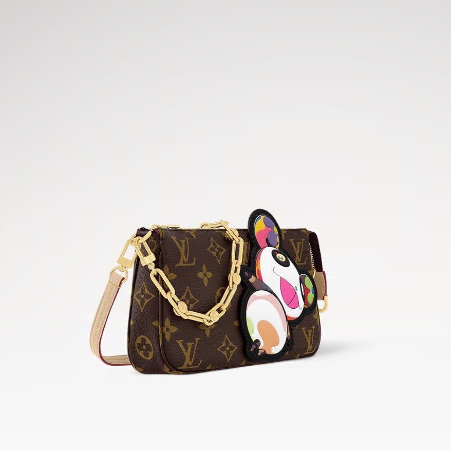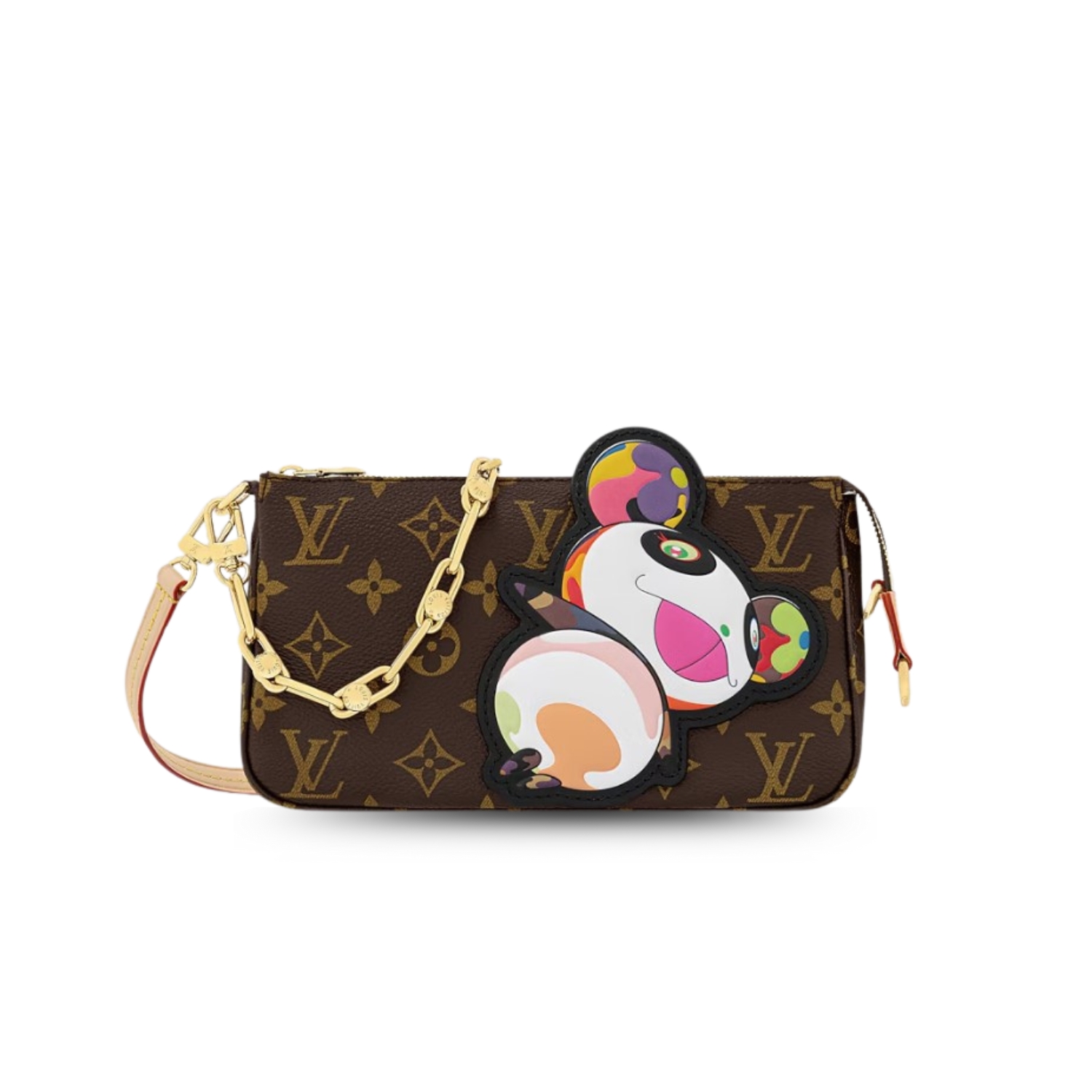 The House’s classic Pochette Accessoires makes a vibrant statement as part of the re-edition of the Louis Vuitton x Murakami collection. Crafted from timeless Monogram coated canvas, the silhouette of the pouch is reworked with the artist’s playful Panda character in vibrant pop colors. The leather strap and chic golden chain are both removable for versatile styling options, while a zipper fastening keeps daily essentials secure.