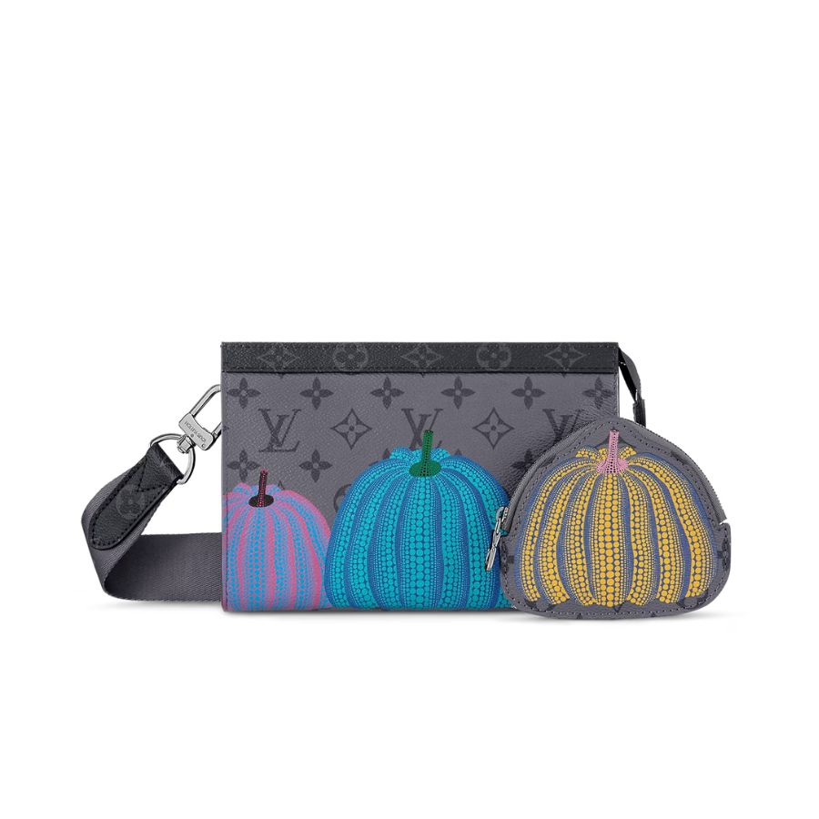 On-trend and practical, the LVxYK Gaston wearable wallet joins the “Pumpkins” theme of the Louis Vuitton x Yayoi Kusama collection with a vibrant new look. The venerated Japanese artist’s iconic pumpkins are printed in bright colors on Monogram Eclipse Reverse canvas. And it comes with a removable pumpkin-shaped pouch, perfect for coins and contactless payment cards.
