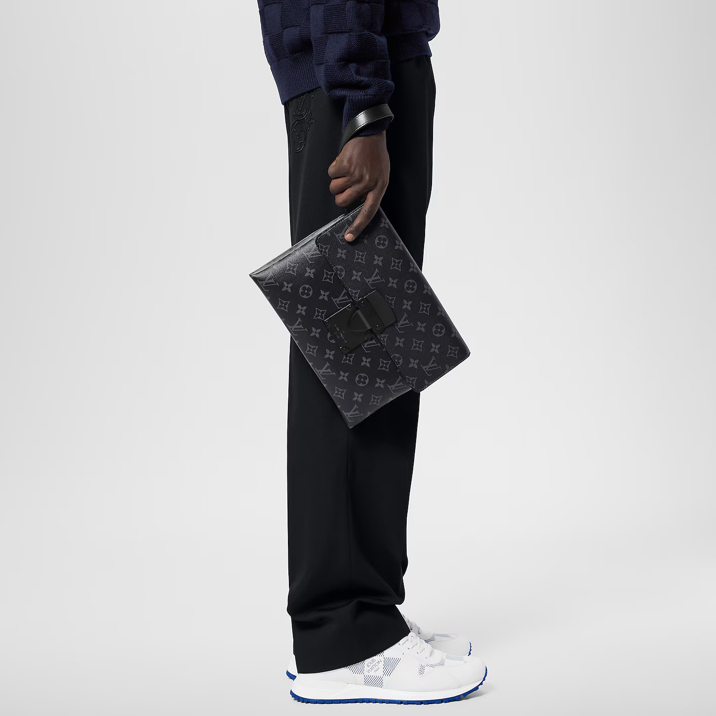 The Pochette S-Lock in Monogram Eclipse canvas is an on-trend way of carrying everyday belongings. The design features a magnetic S-Lock inspired by the nearly indestructible trunk lock created by Georges Vuitton in the 1880s. The pouch has three pockets to keep things organized and can be carried with its removable wrist strap.