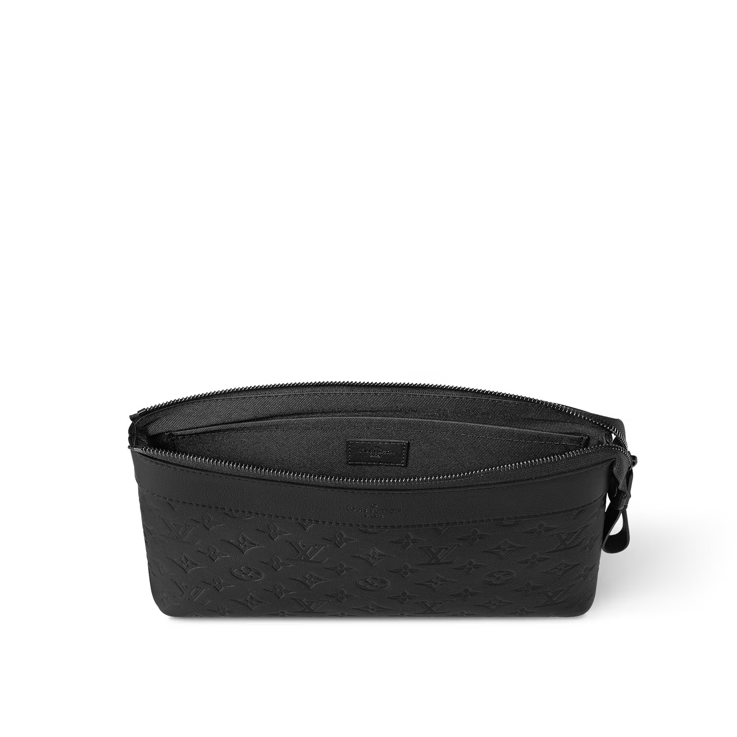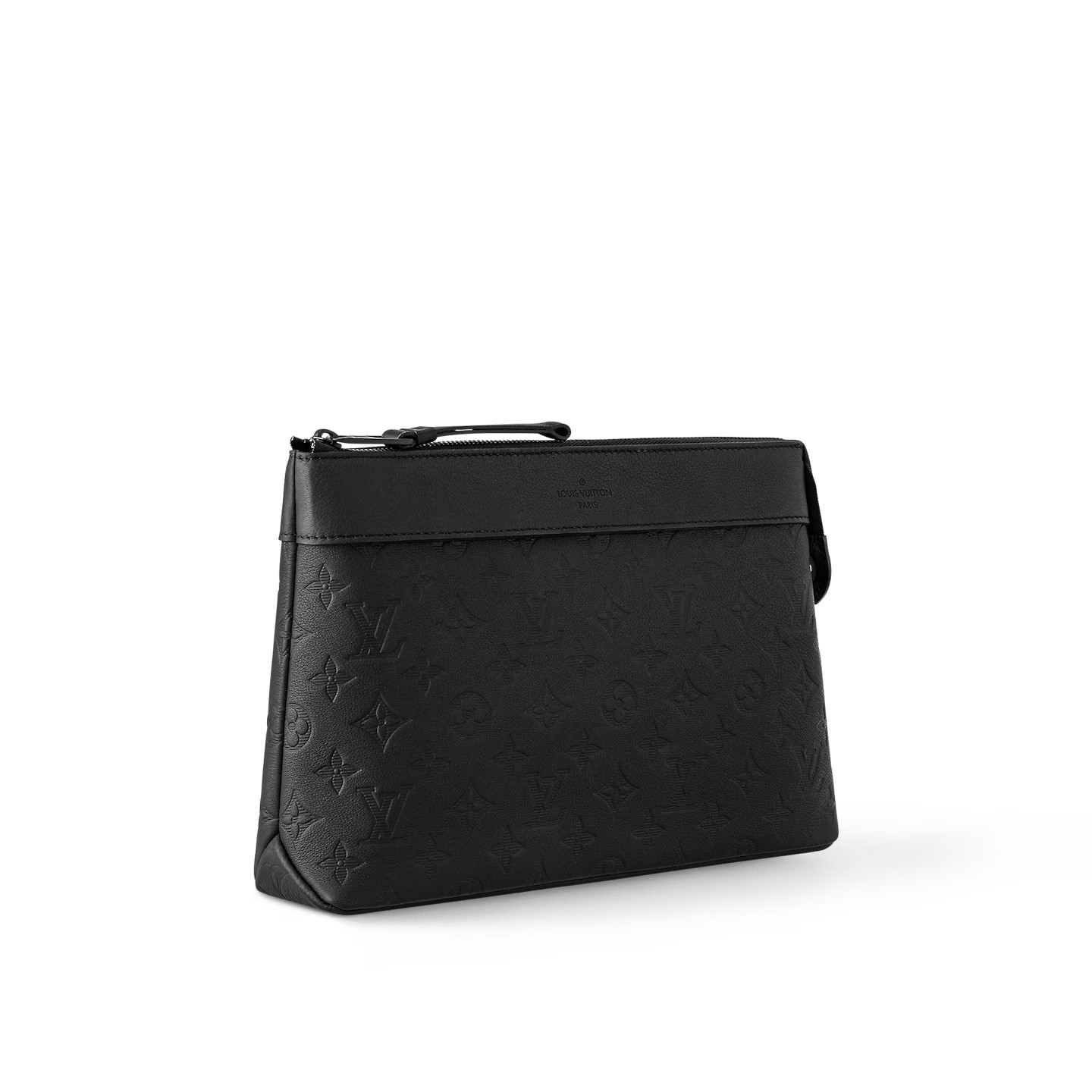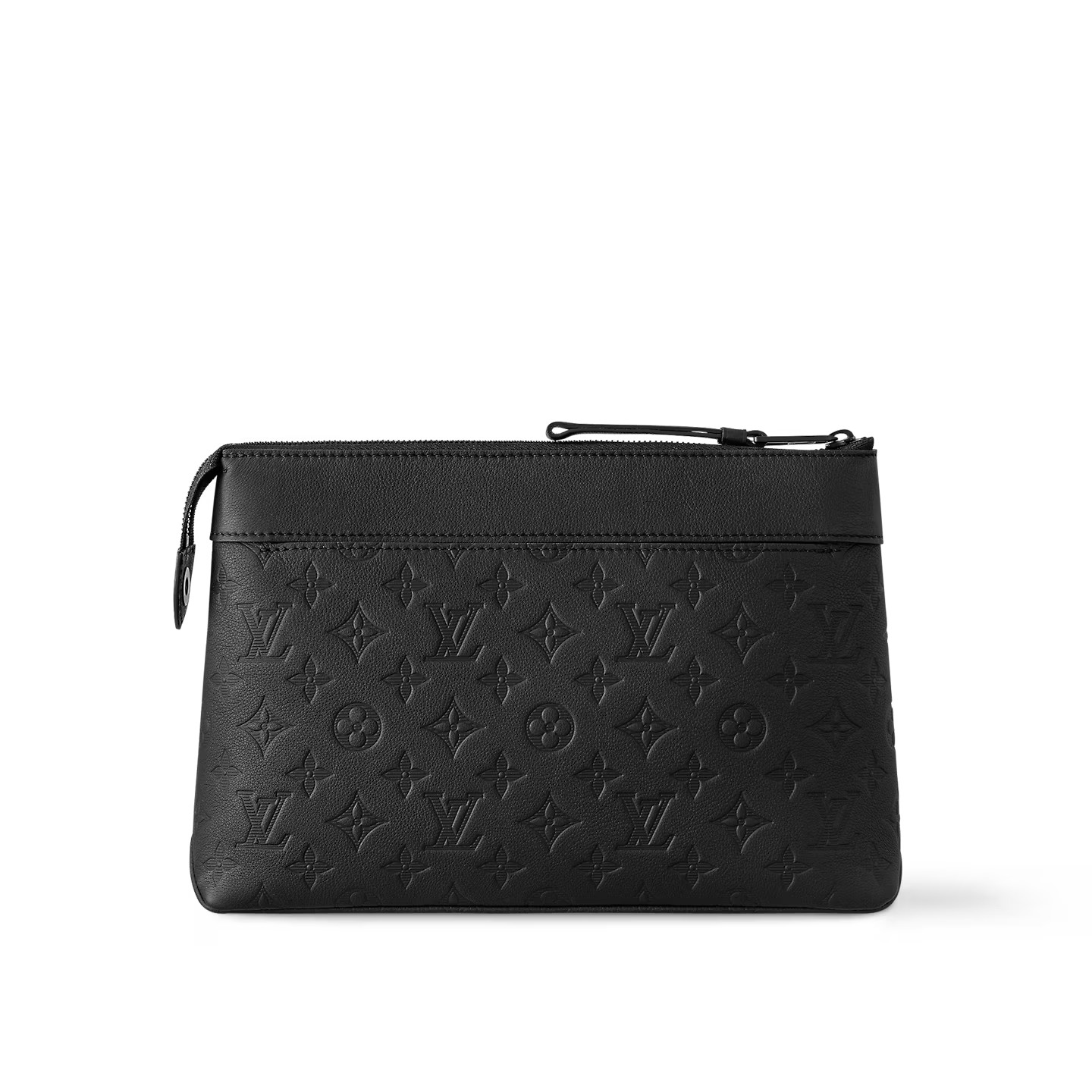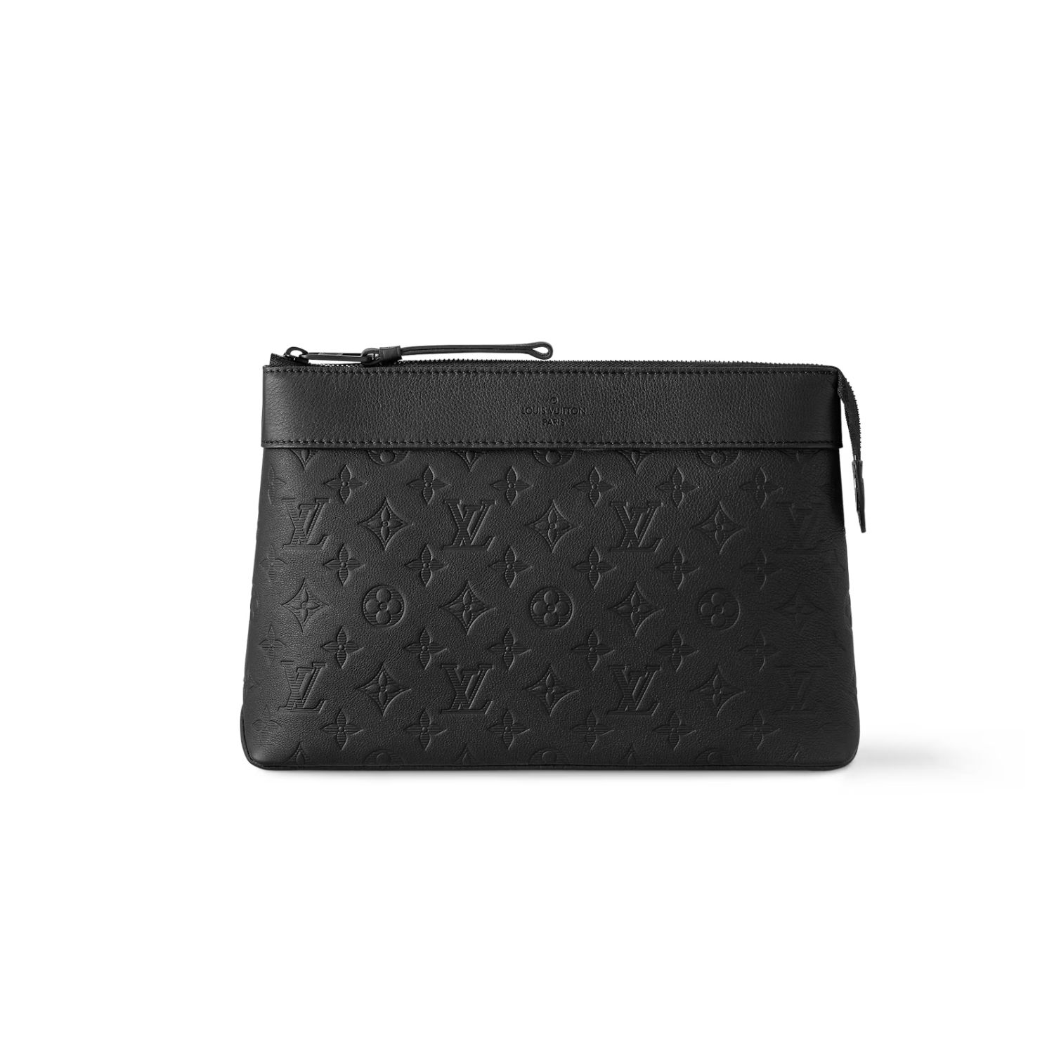 This bag is discreetly embossed with the Monogram pattern. In addition to clutch-carry, the pouch can be used with its wrist strap. A back pocket brings added functionality.