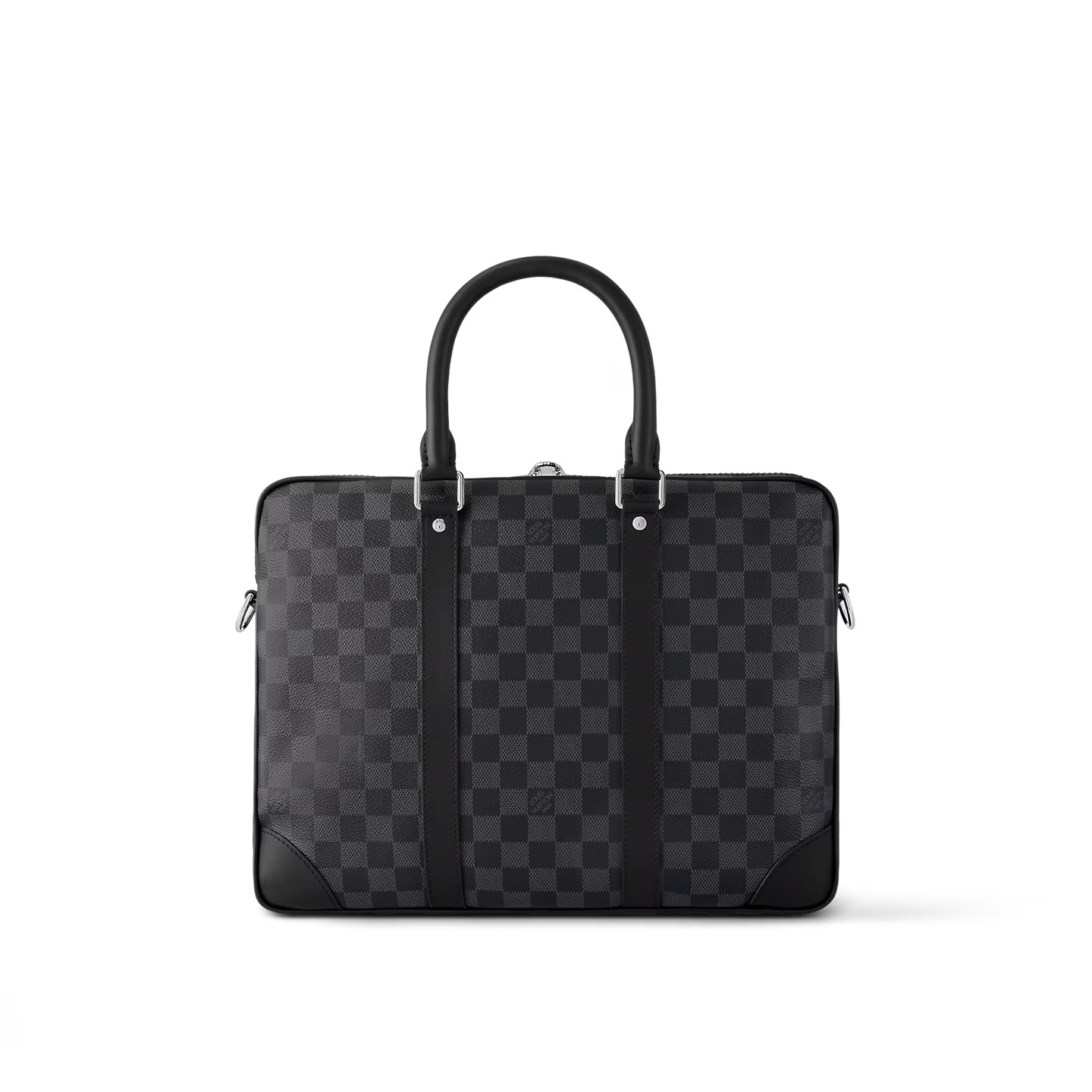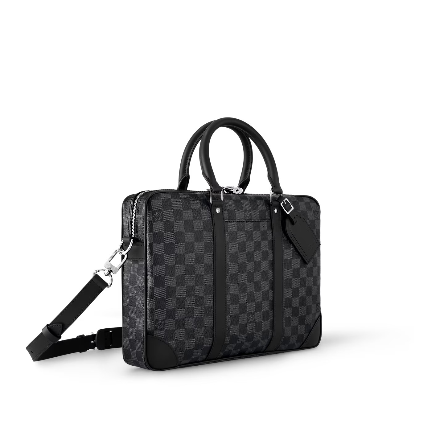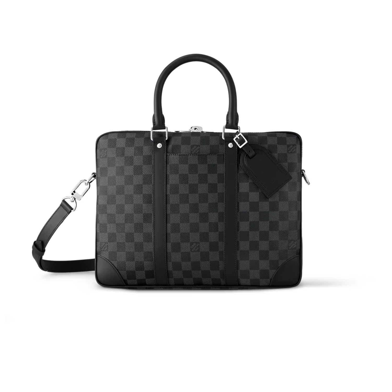 The Porte-Documents Voyage PM briefcase is made from Damier Graphite coated canvas black side bands, reinforced corners, top handles, and name tag. There’s an outside pocket for a smart phone and a padded interior compartment large enough for a 13-inch laptop. The removable and adjustable strap enables shoulder carry.