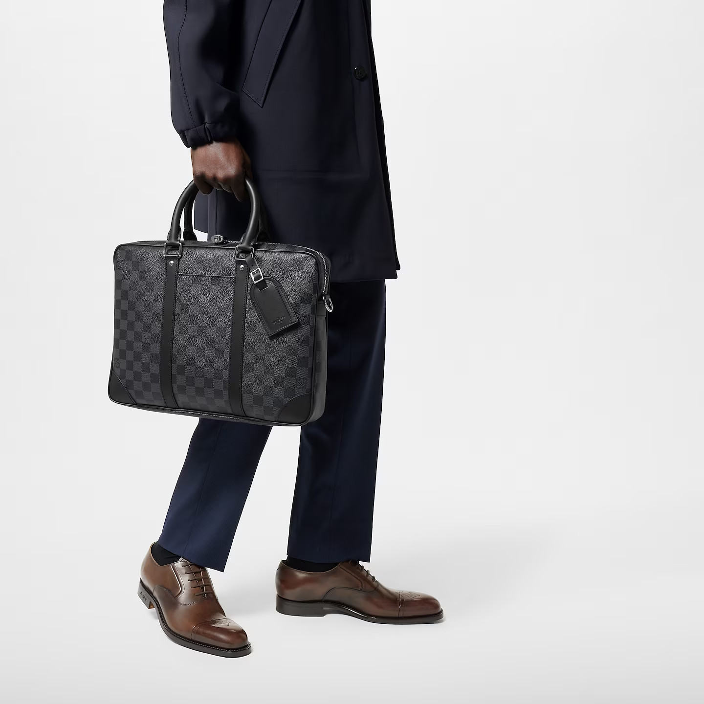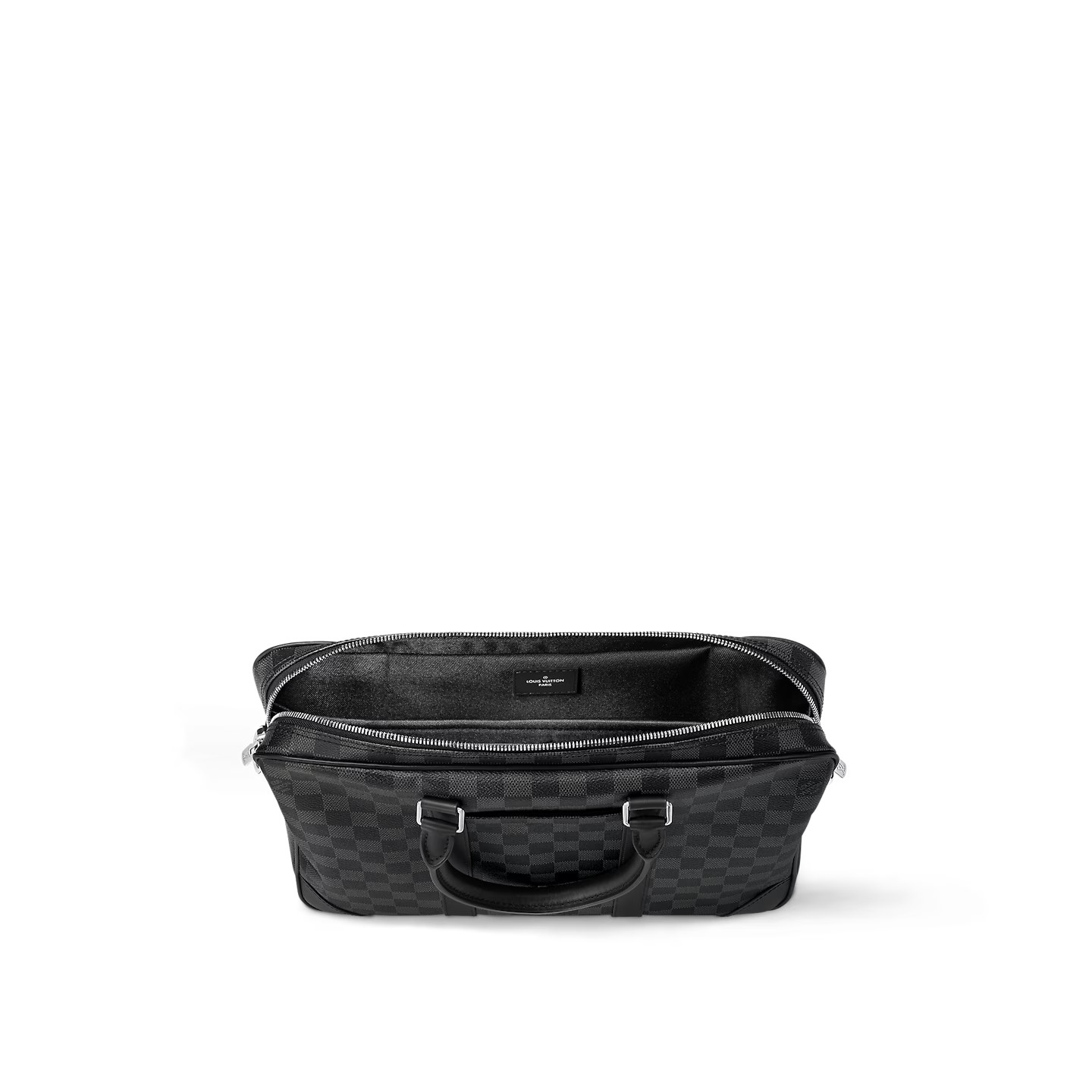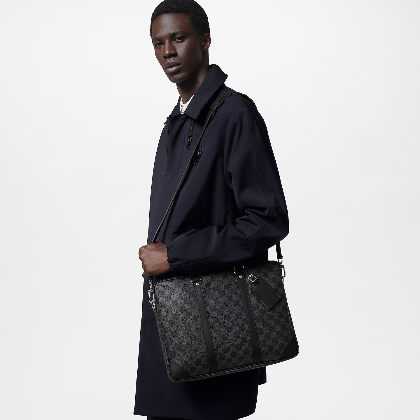 The Porte-Documents Voyage PM briefcase is made from Damier Graphite coated canvas black side bands, reinforced corners, top handles, and name tag. There’s an outside pocket for a smart phone and a padded interior compartment large enough for a 13-inch laptop. The removable and adjustable strap enables shoulder carry.