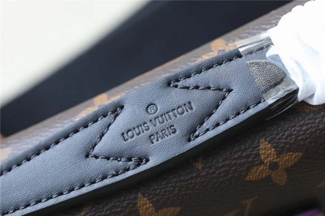 Monogram Macassar coated canvas and Purple Textile lining Black hardware V stitching and embossed signature on the handle S-Lock magnetic closure Large front pocket Inside zipped pocket Inside flat pocket Strap:Not removable, adjustable Strap drop: 13.0 inches Strap drop max: 22.8 inches Handle:Single