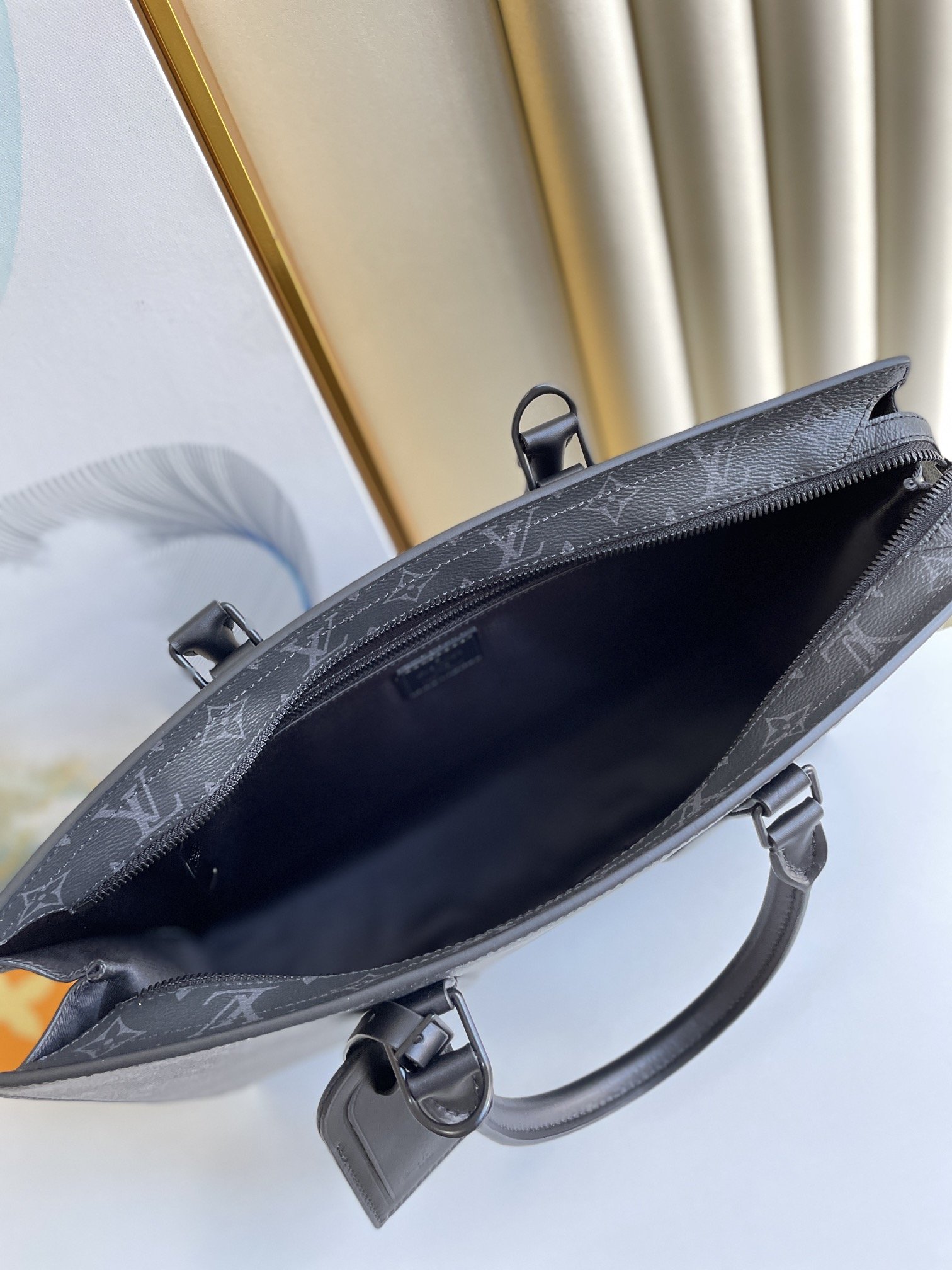 The Sac Plat Horizontal Zipper bag is made from Monogram Eclipse canvas and black and signed with discreet embossed LV Initials. Featuring a Monogram name tag, it pays homage to Louis Vuitton’s roots while its sleek design sets a new standard for casual business chic. The leather top handles make for comfortable carry.