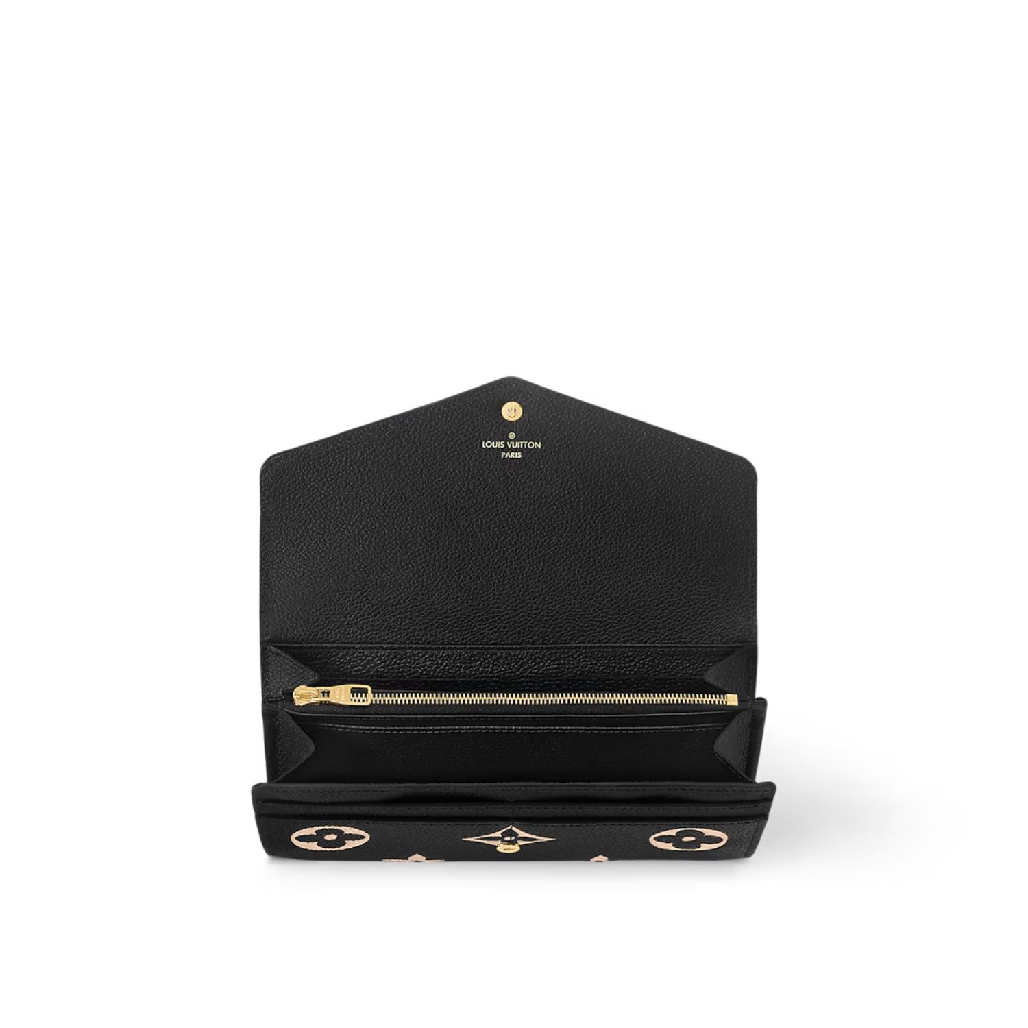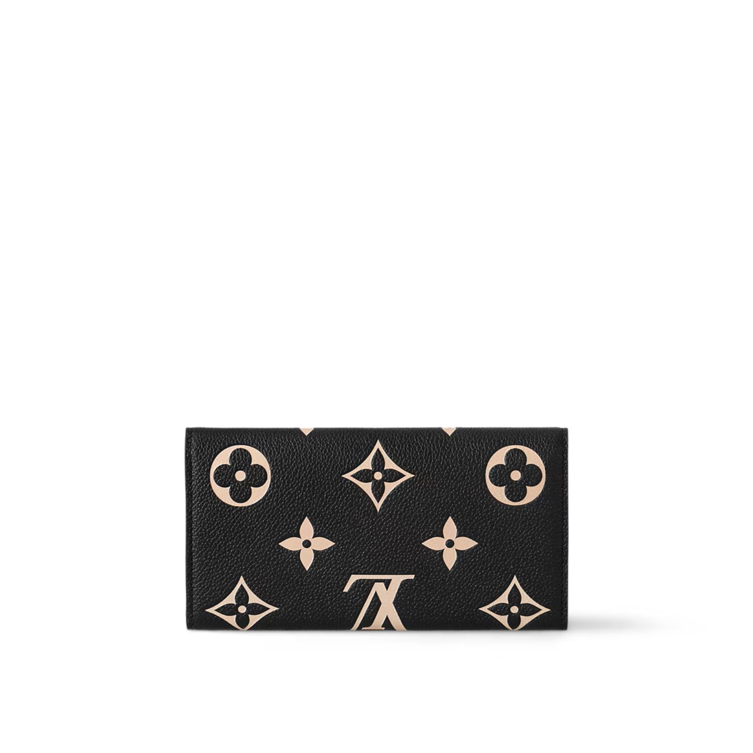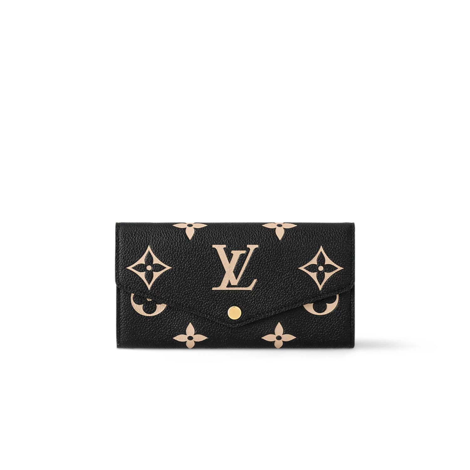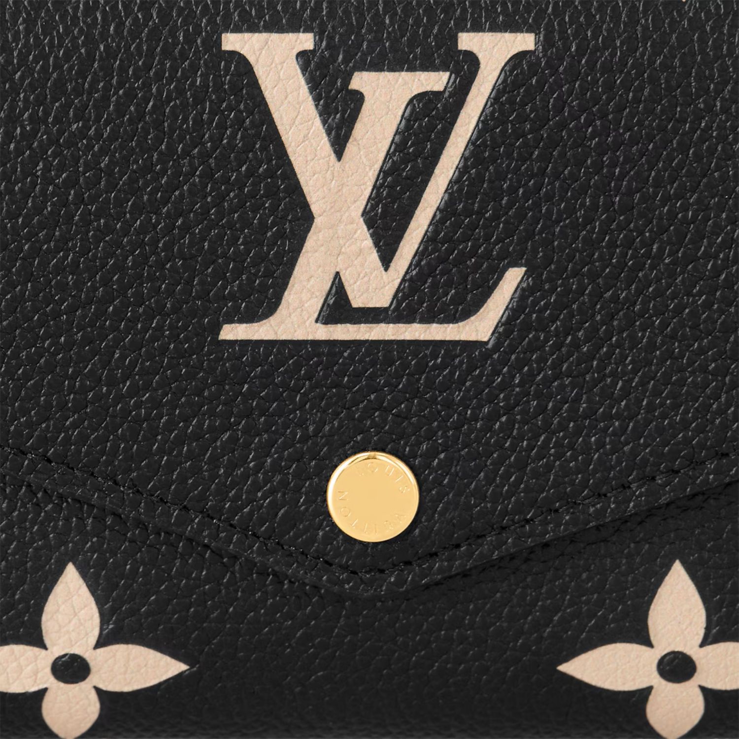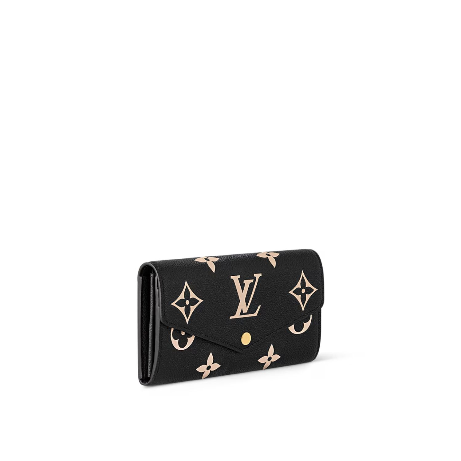 Louis Vuitton's classic Sarah wallet looks elegant in bicolor Monogram Empreinte leather, which is embossed with the signature Monogram pattern. The envelope-style flap, secured with a gold-tone press stud, opens to reveal a well-organized interior. In addition to two large compartments and several pockets, this wallet offers 16 card slots.