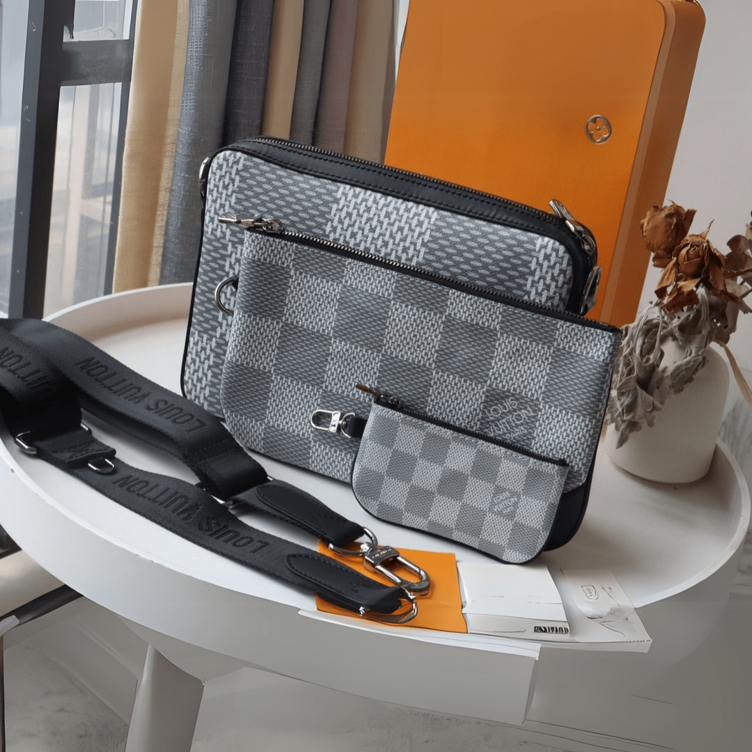 The Trio Messenger bag for men is made from Monogram Eclipse canvas and its mirror twin, Monogram Eclipse Reverse. The iconic motif in tone-on-tone shades of gray complements the lines of this functional hybrid. More than a traditional cross-body bag, it has a removable zipped pocket and a removable coin purse attached to the strap