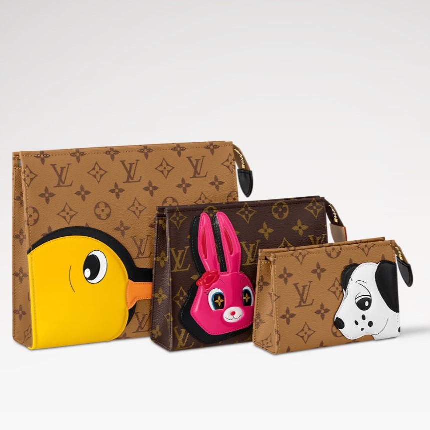 This collectible Trio Toilet Pouch is a set of three different-sized pouches in Monogram Reverse canvas with vibrant-colored, washable linings. As part of the House’s exclusive collaboration with Chinese artist Sun Yitian, each pouch features a calfskin patch in the shape of one of her iconic cartoon-animal heads.