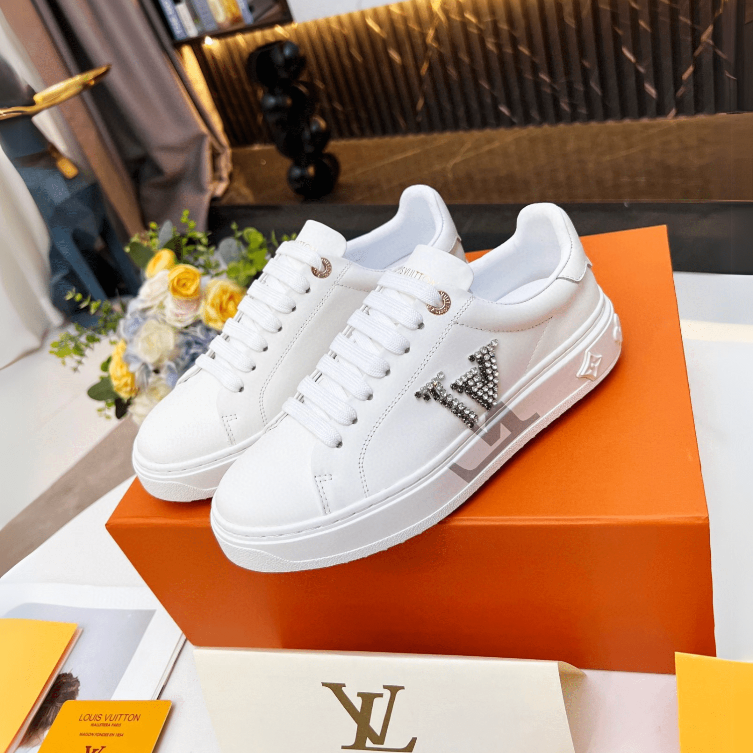 The emblematic Time Out sneaker is revisited in printed with the oversized LV Circle signature on the side. Other refined details of this design include Louis Vuitton-engraved, gold-tone eyelets and the 3-D pattern of Monogram Flowers on the distinctive elevated outsole.