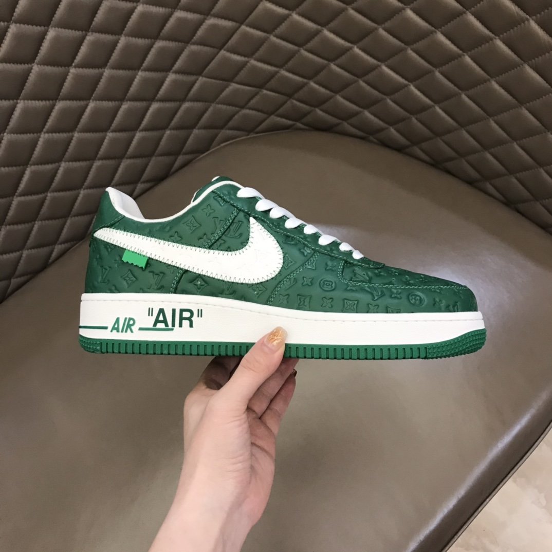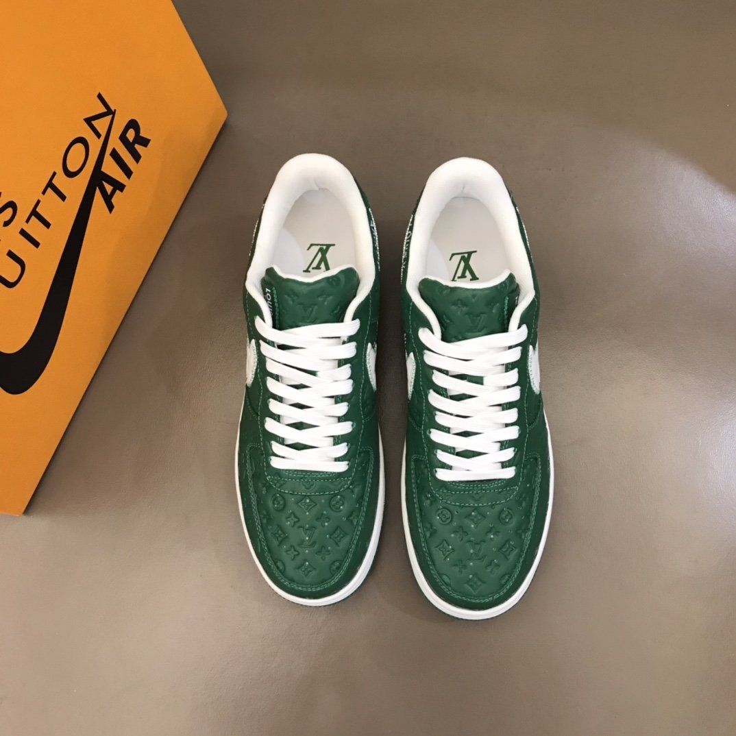 Low top Green/ White Embossed with the Monogram pattern. The white midsole is marked with “AIR” over the standard AIR fixture. Style canvas Rubber sole