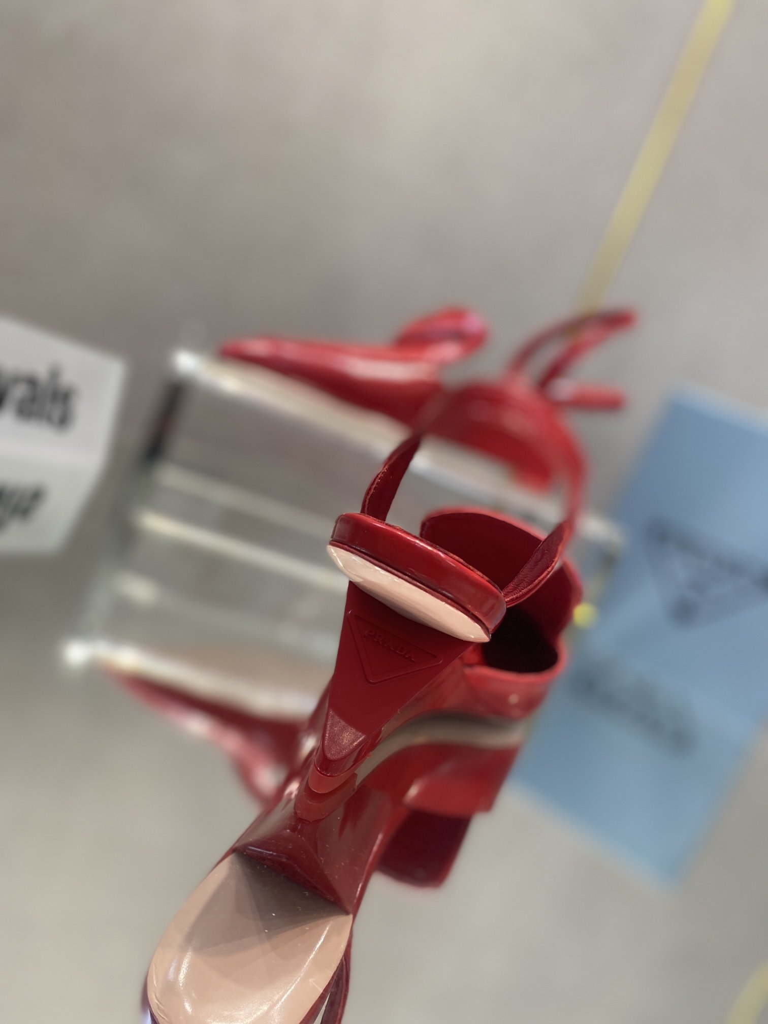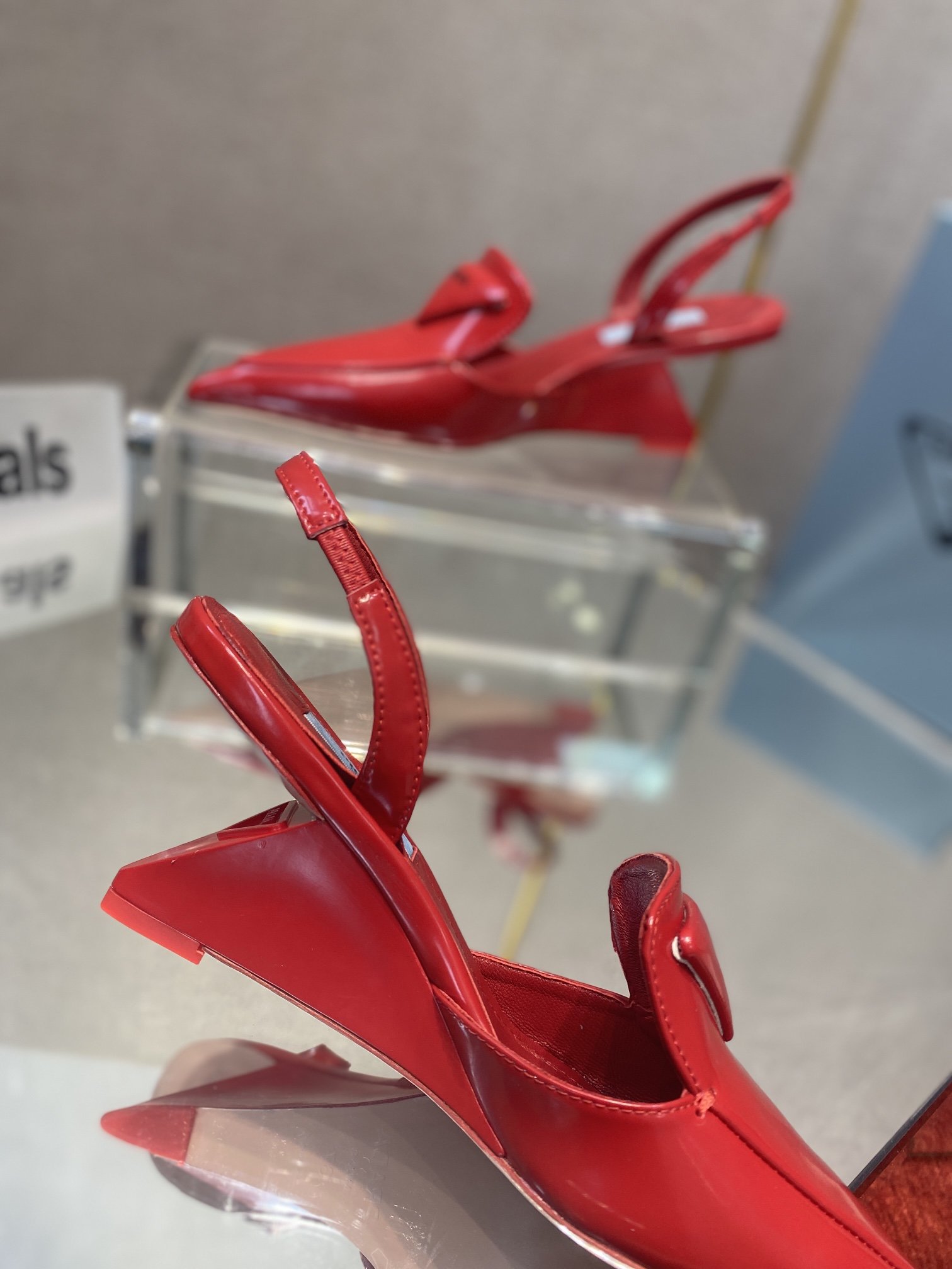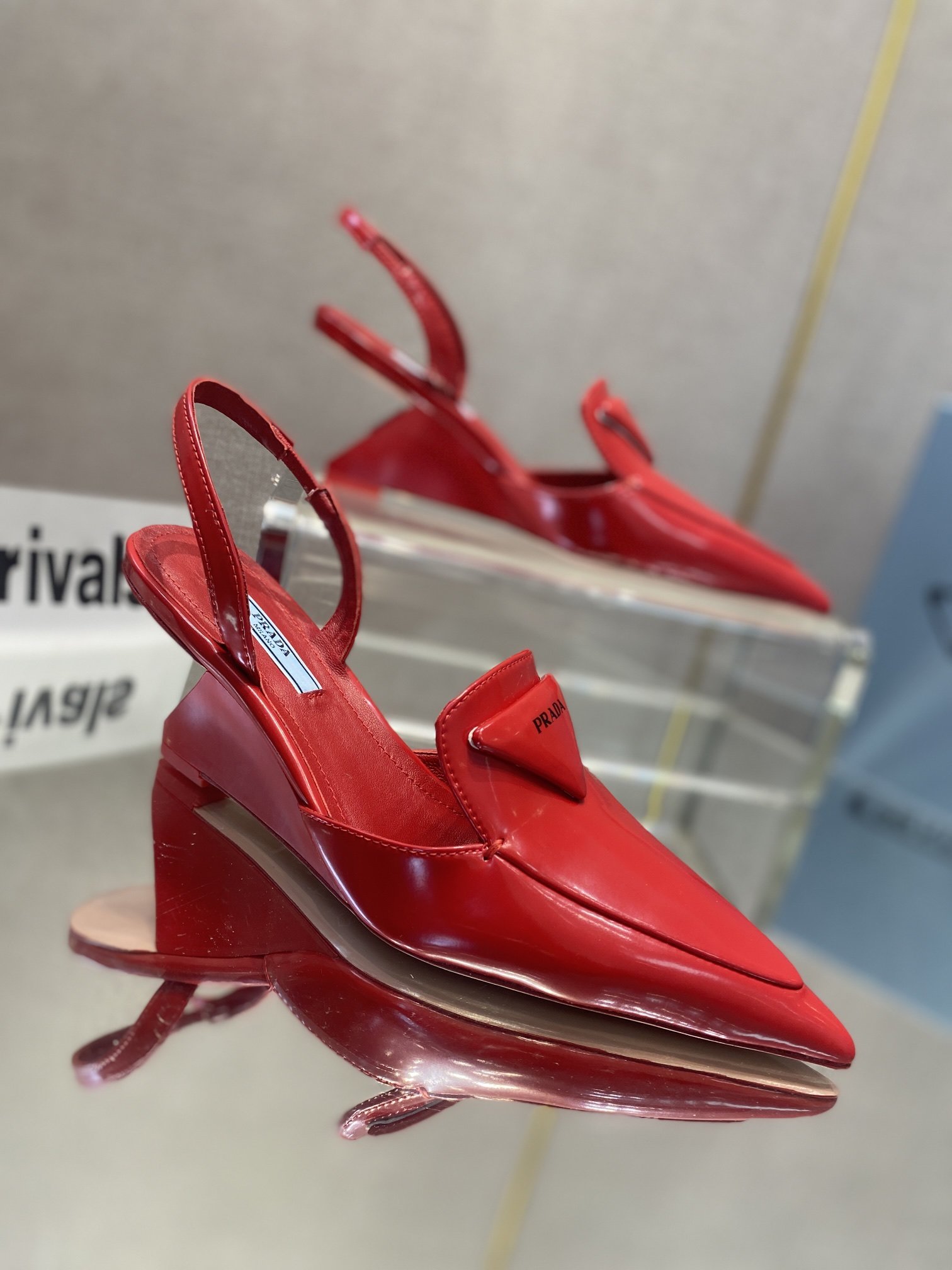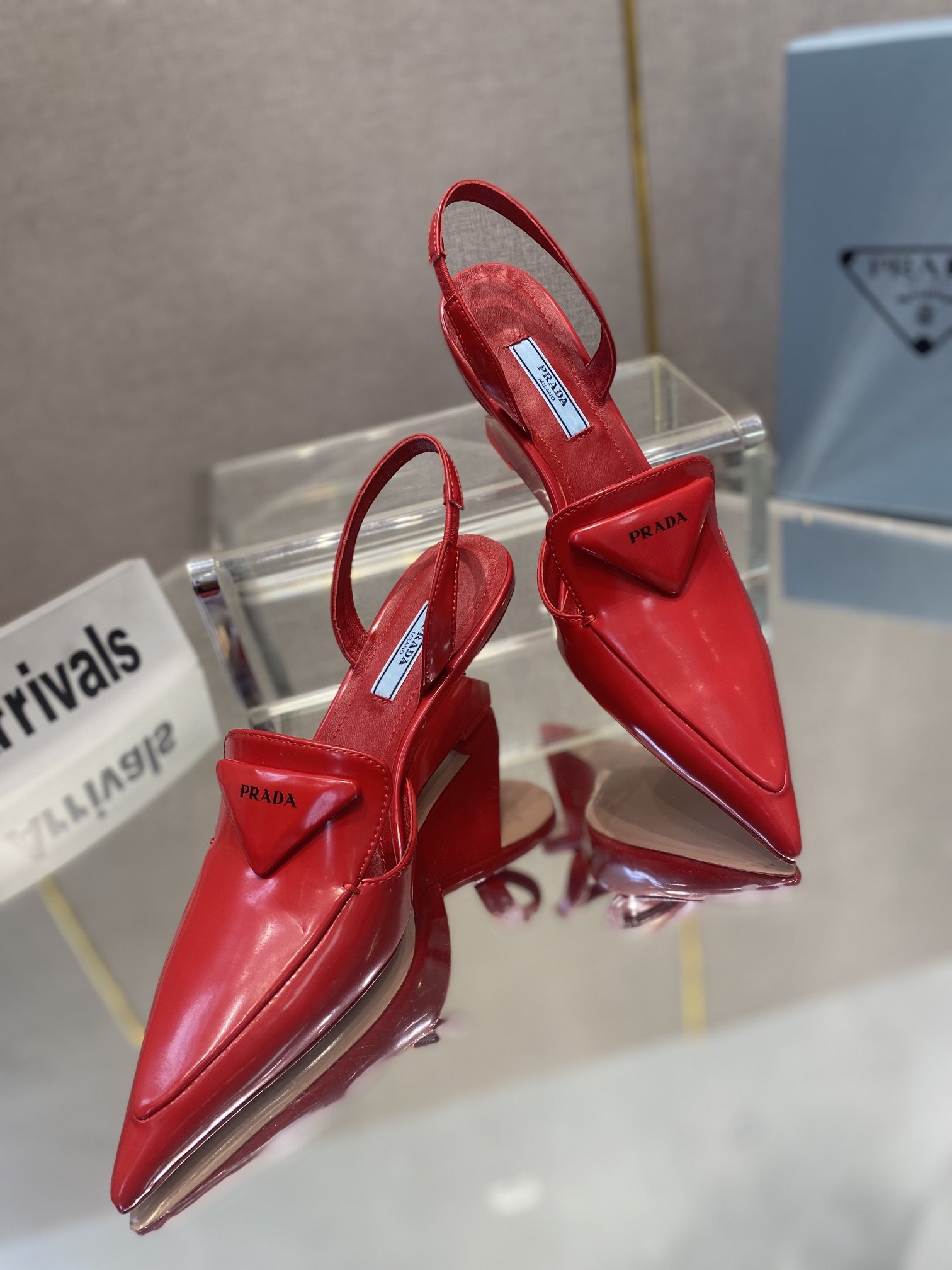 Minimalism and femininity meet in a new interpretation of the slingback, an iconic style of Prada collections. The silhouette with its pointy toe and modernist wedge reimagines the geometric shape of the brand's distinctive triangle, the shape of which inspires the construction of the heel and the covered and slightly padded front detail. A play of volumes and constructions emphasizes the clean, decisive lines of the shoe made of fine brushed with a lacquer finish.