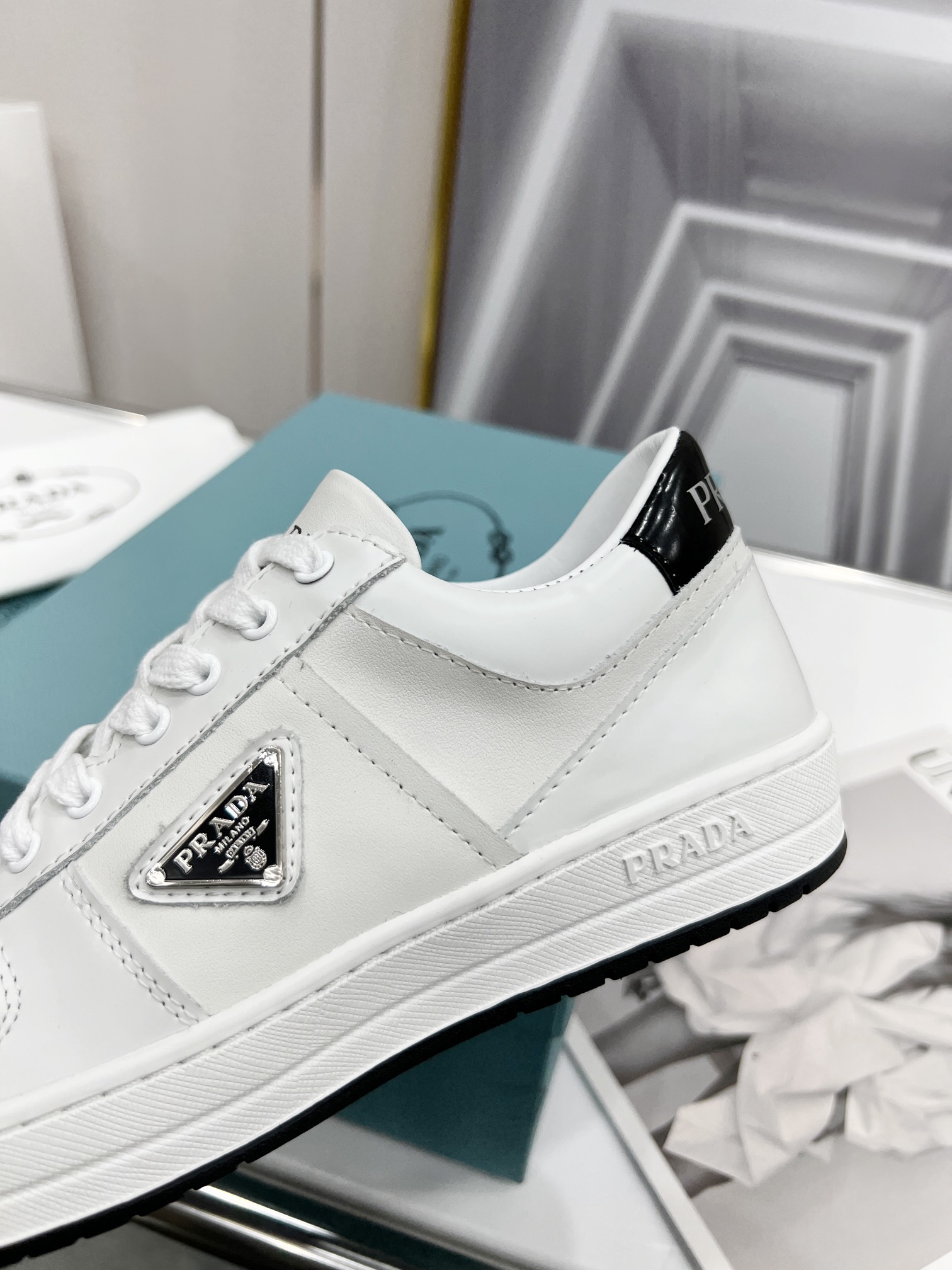 These sporty sneakers made of perforated feature various interpretations of the Prada logo that appears on the tongue, along the light rubber sole, and in the form of the iconic enameled triangle logo decorating the side.