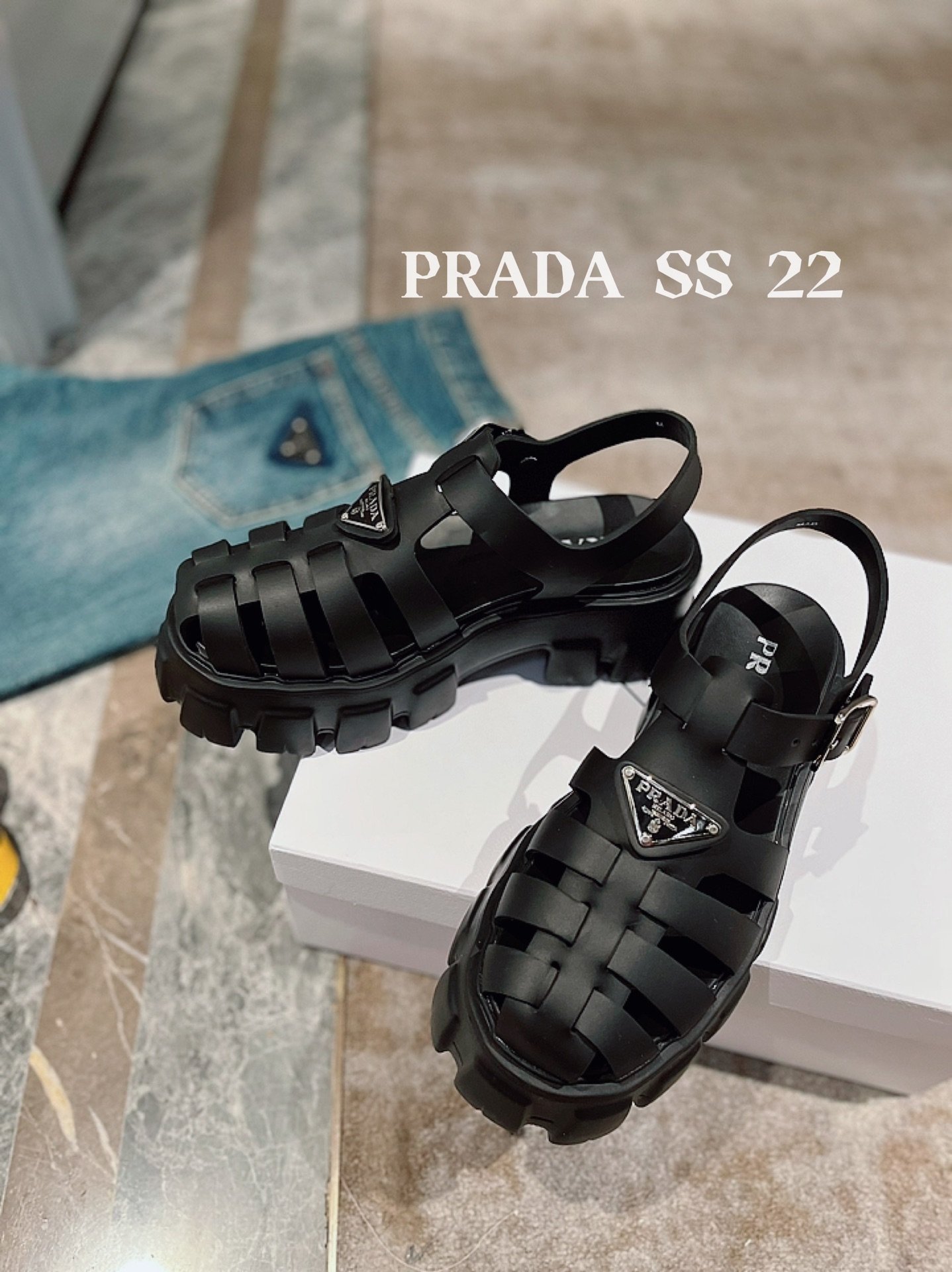 The chunky yet lightweight design of the iconic Monolith sole made of rubber is an expression of a timeless design, monolithic and unique, that reimagines Prada's dual soul with a modernist twist. Made of rubber for a fun, contemporary look, the silhouette reinterprets retro beach footwear in a totally new way that reflect Prada's hybrid soul.