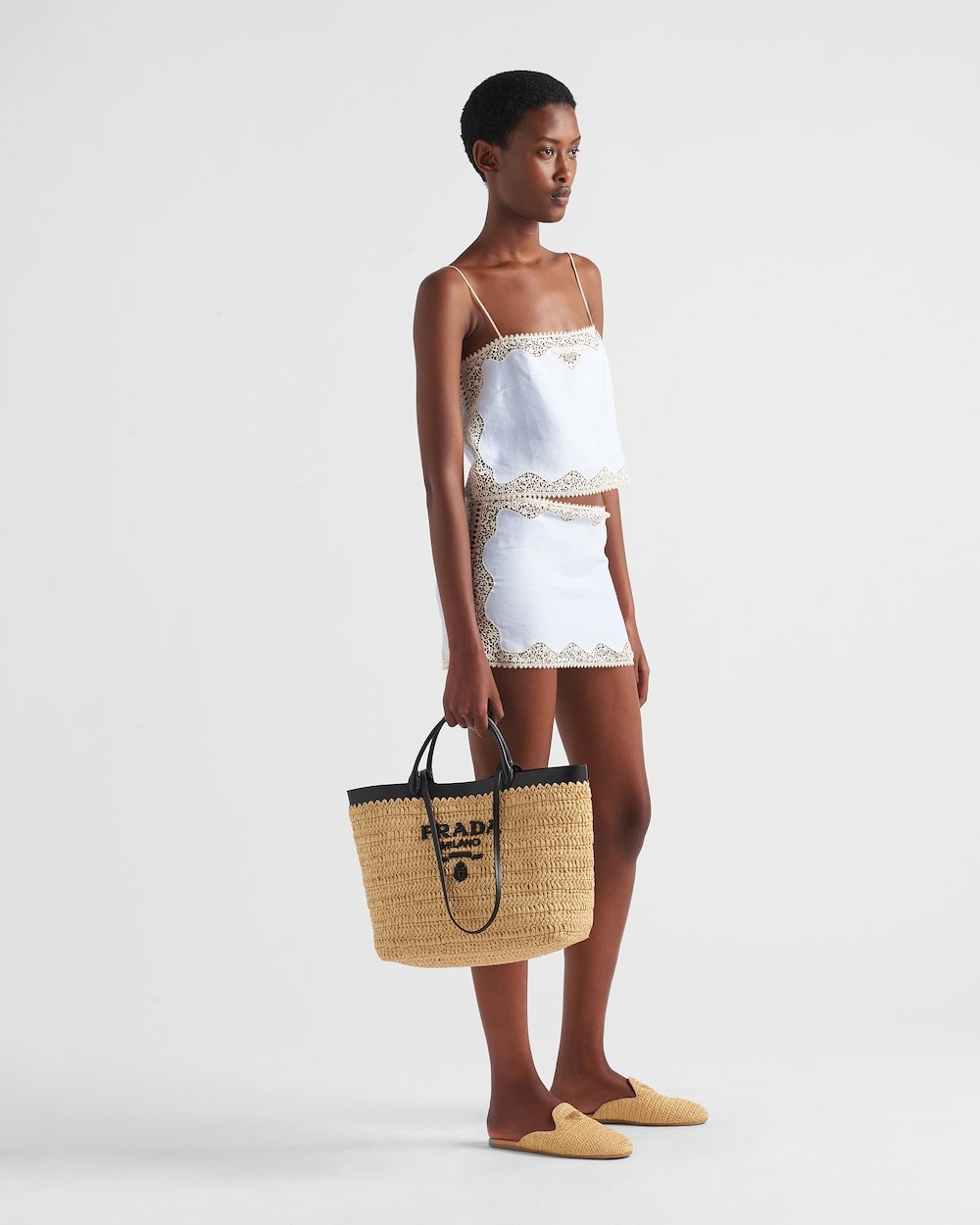 The contrasting embroidered lettering logo on the front embellishes the roomy accessory with double handles for use as a handbag or shoulder bag.