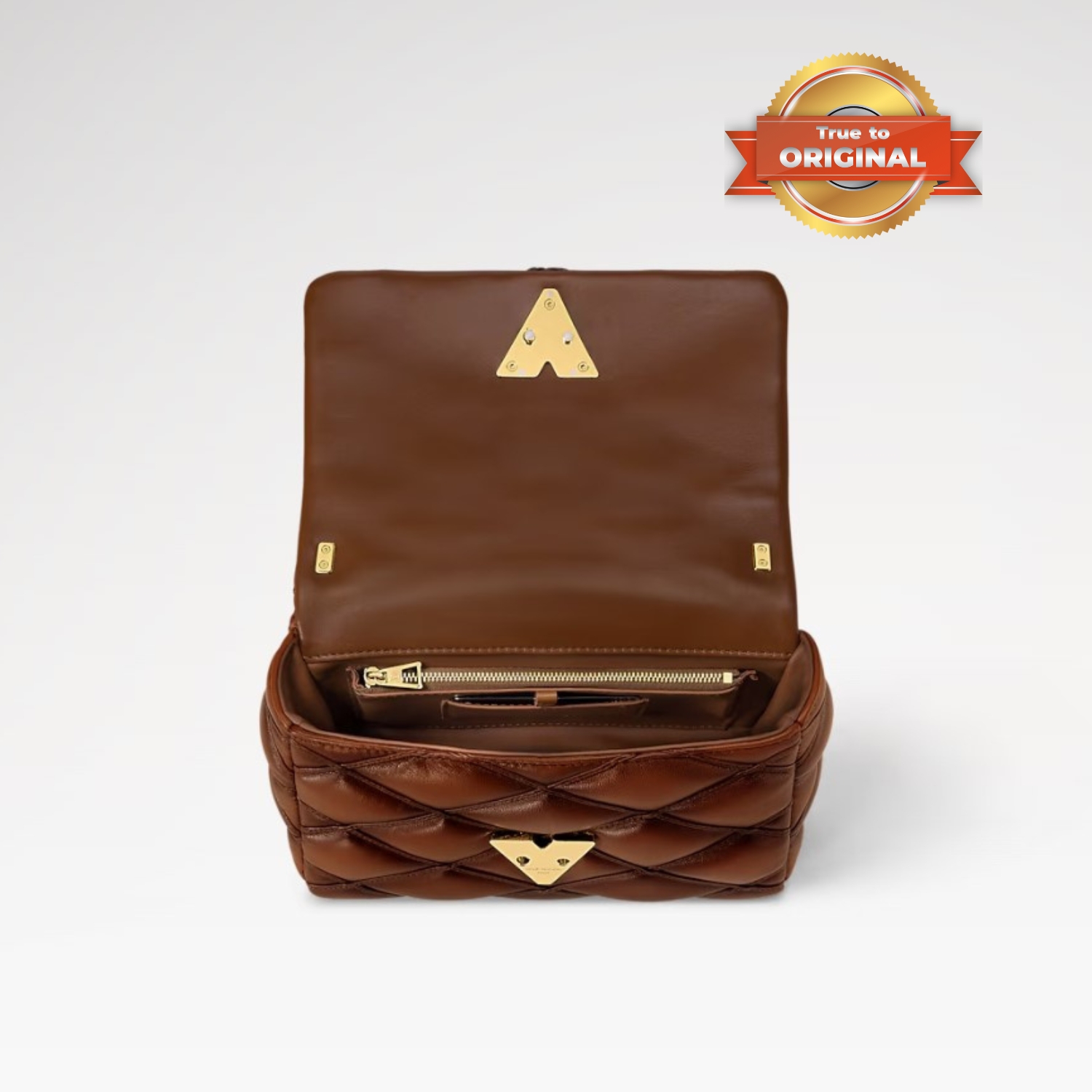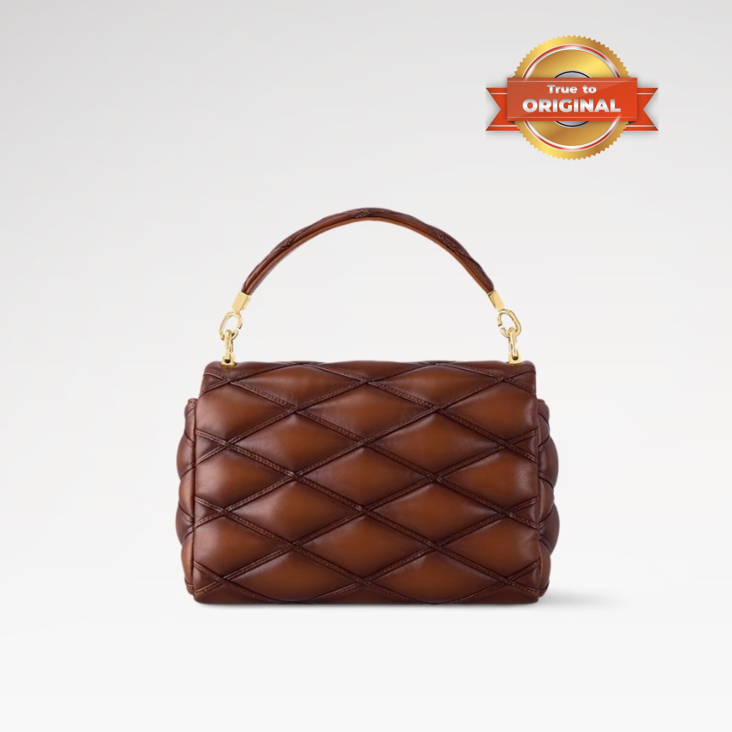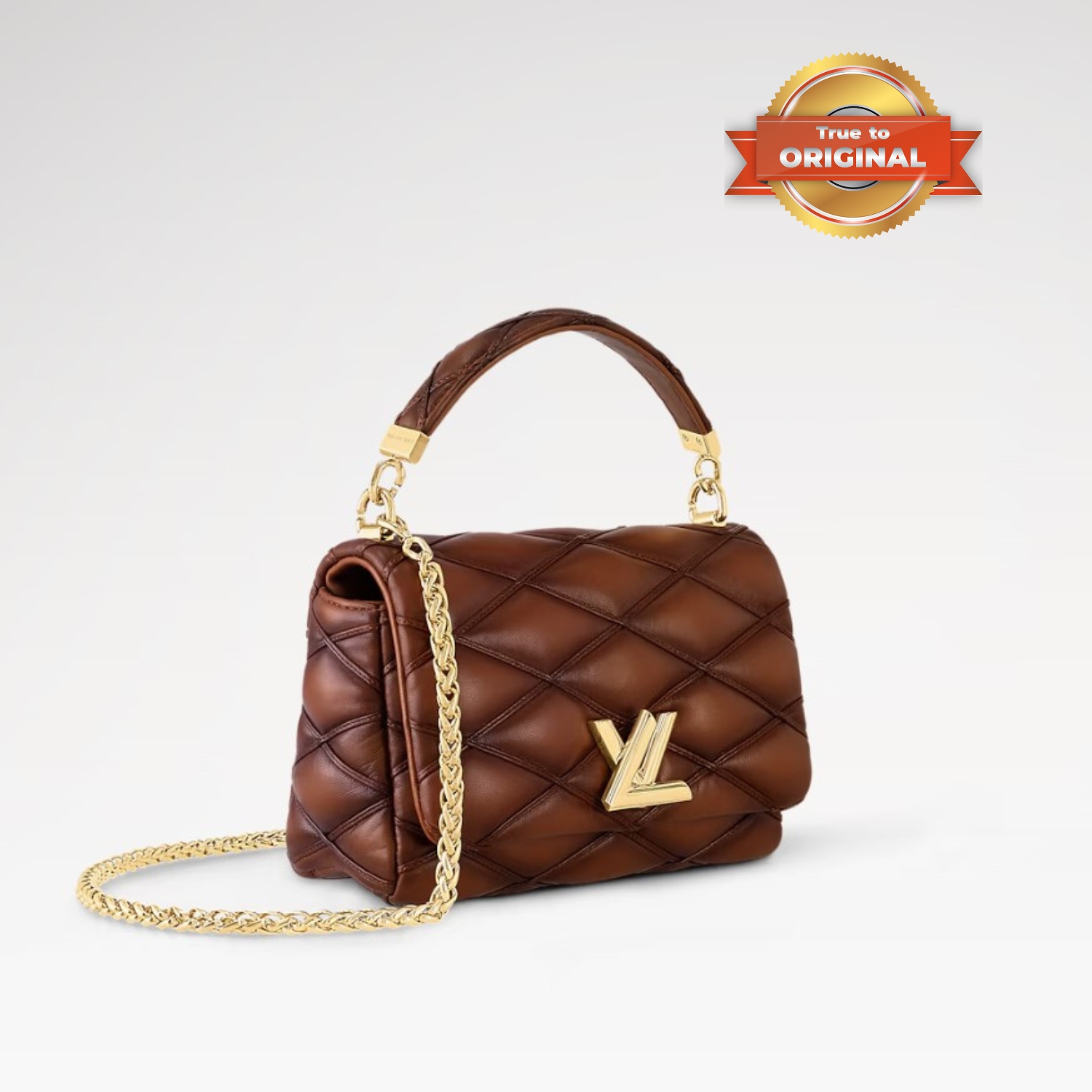 Nicolas Ghesquière explores new techniques to embellish the GO-14 MM handbag. Here padded lambskin is quilted, and a refined toasted effect is applied by hand, giving it a futuristic allure. The top handle and adjustable chain – both detachable – enable carry options. It’s signed with the House’s emblematic LV Twist lock.