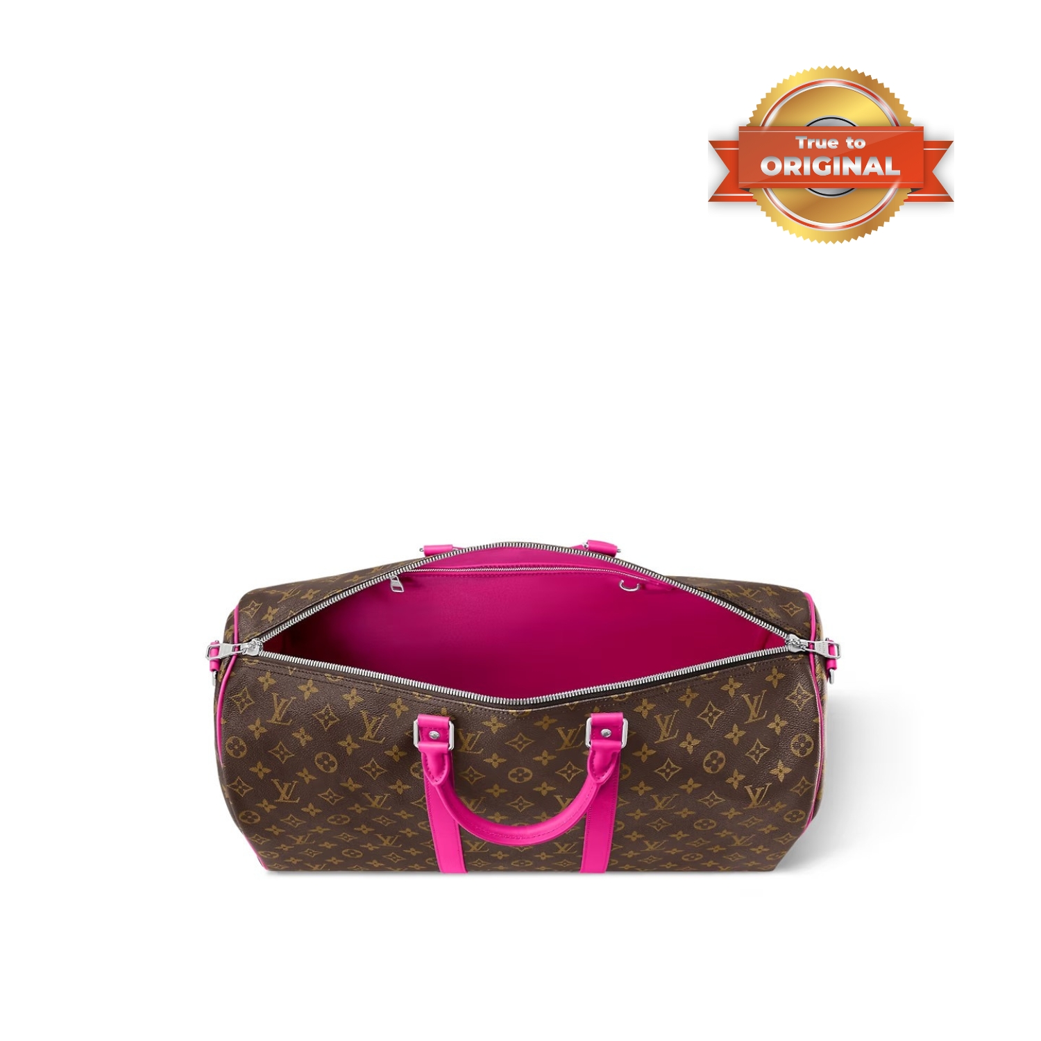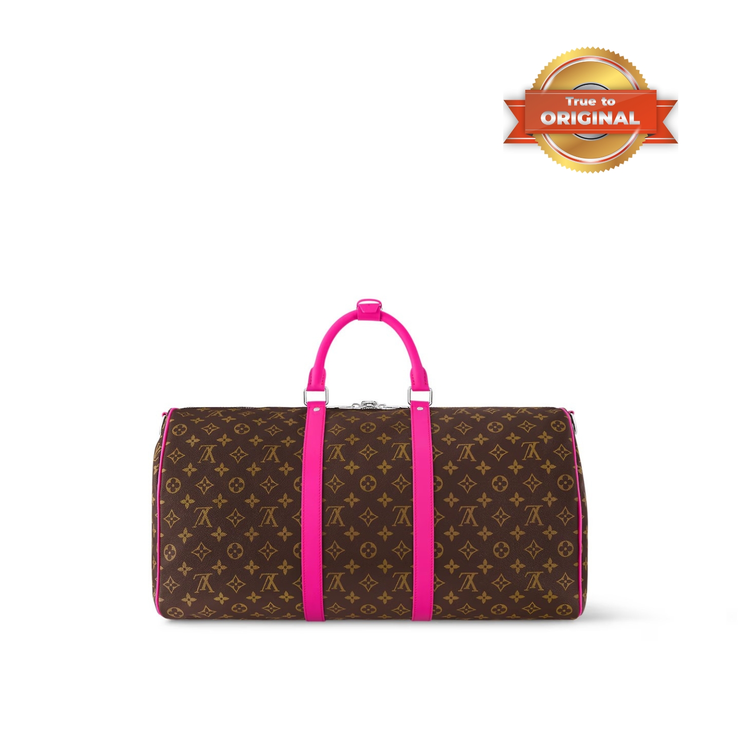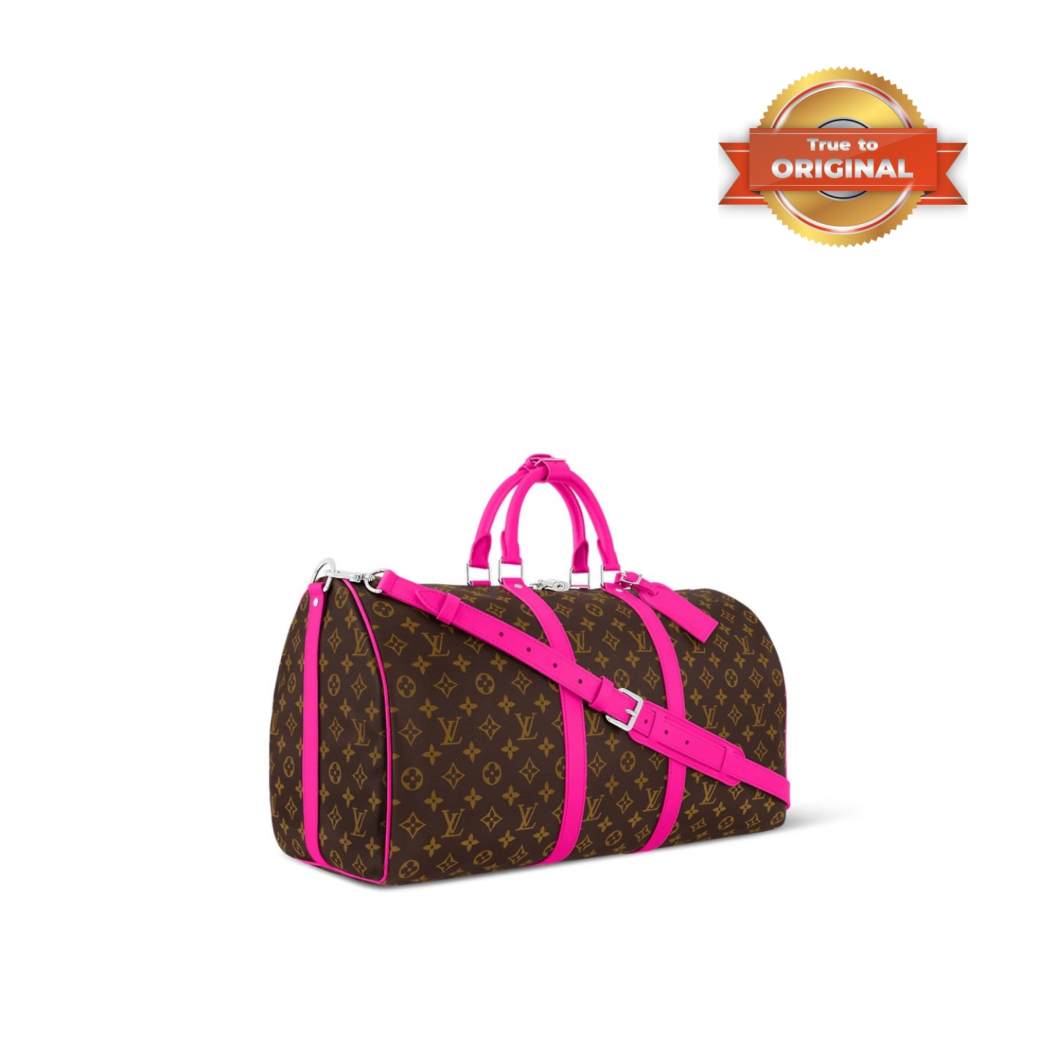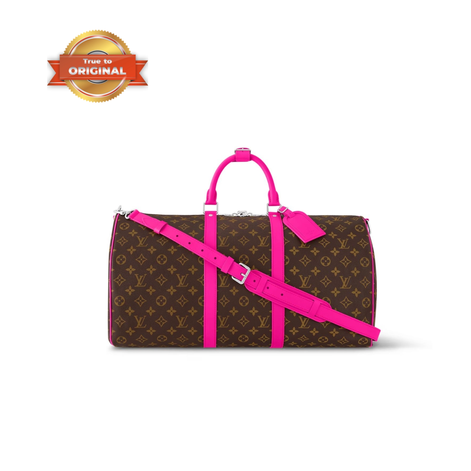 The Keepall Bandouliere 50 travel bag is made from Monogram canvas with coloured top handles, lateral bands and a name tag. The inside is lined with textiles in the same bright colour for a bag that is as joyful as it is functional. The generously sized Keepall 50 can be brought onto the plane as carry-on luggage.