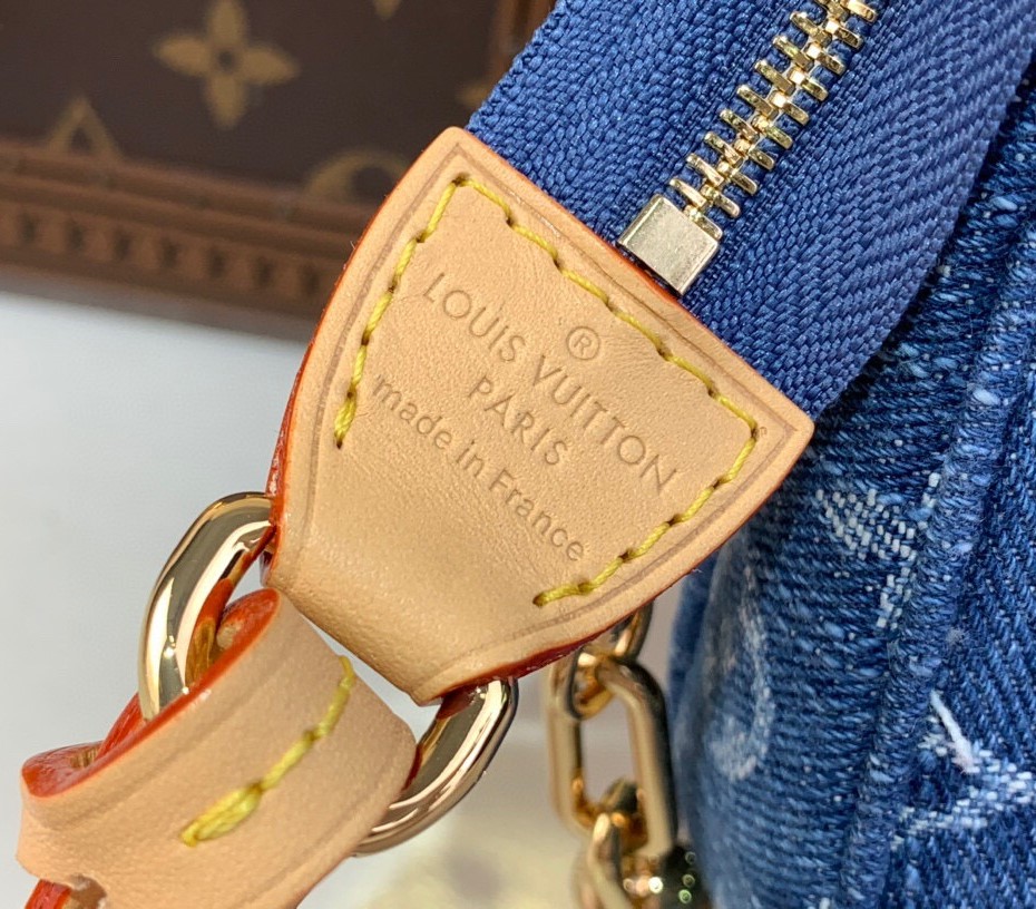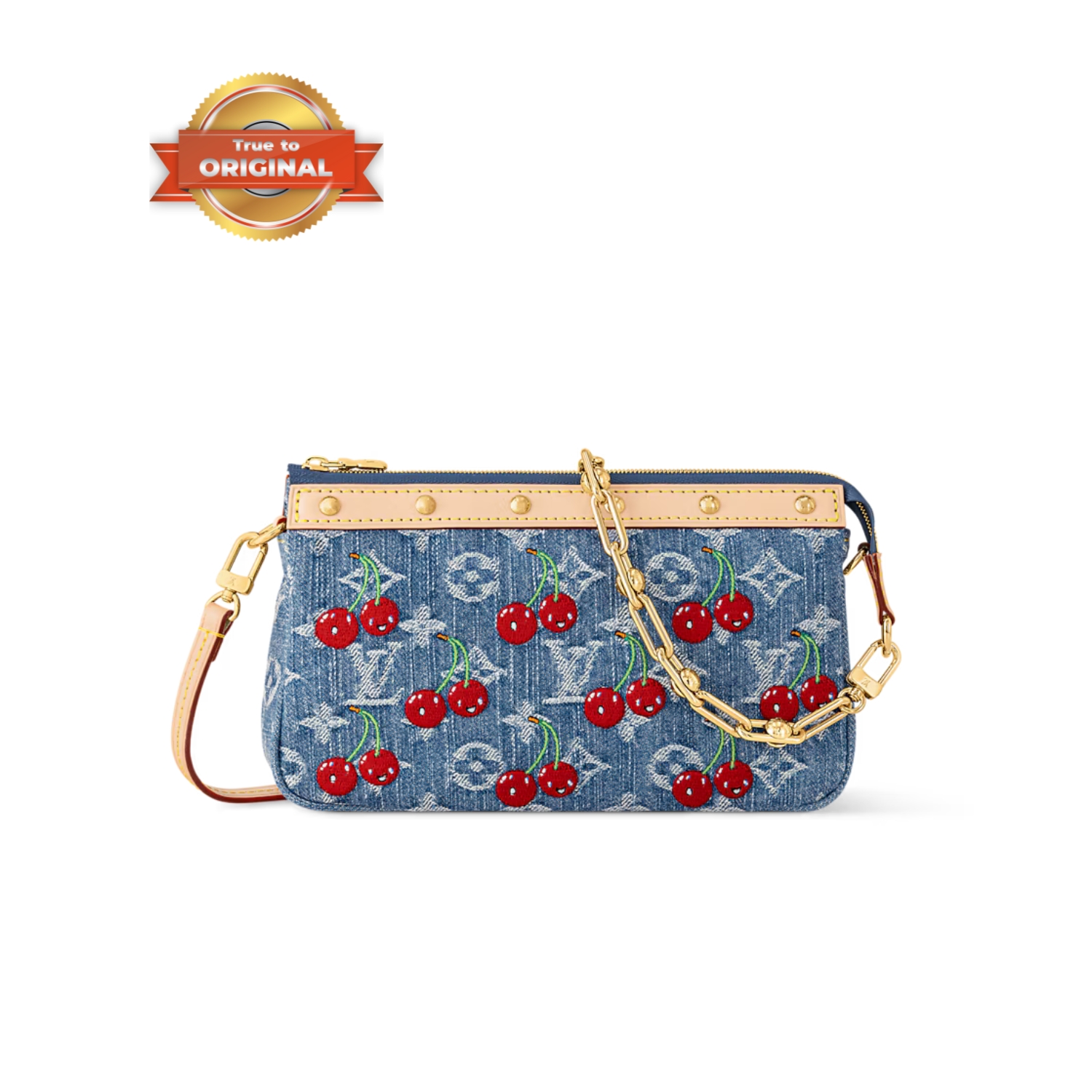 Size: 8.7 x 5.1 x 1.6 inches / 22 x 13 x 4 cm (Length x Height x Width)The Pochette Accessoires makes a chic statement as part of the celebratory second edition of the Louis Vuitton x Murakami collection. It is crafted from Monogram denim detailed with vibrant embroidered cherry motifs in the Japanese artist’s signature playful aesthetic, while gleaming golden hardware complete the look.