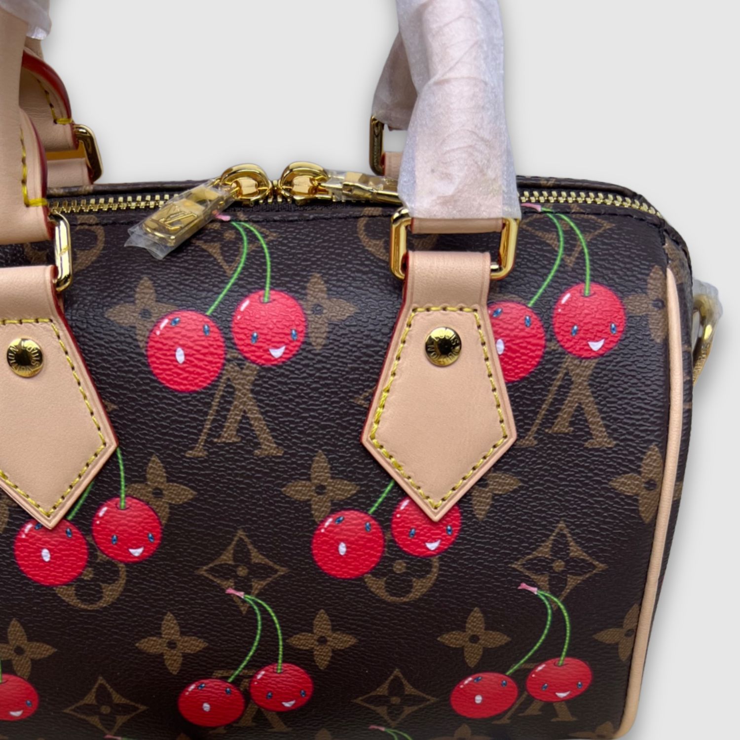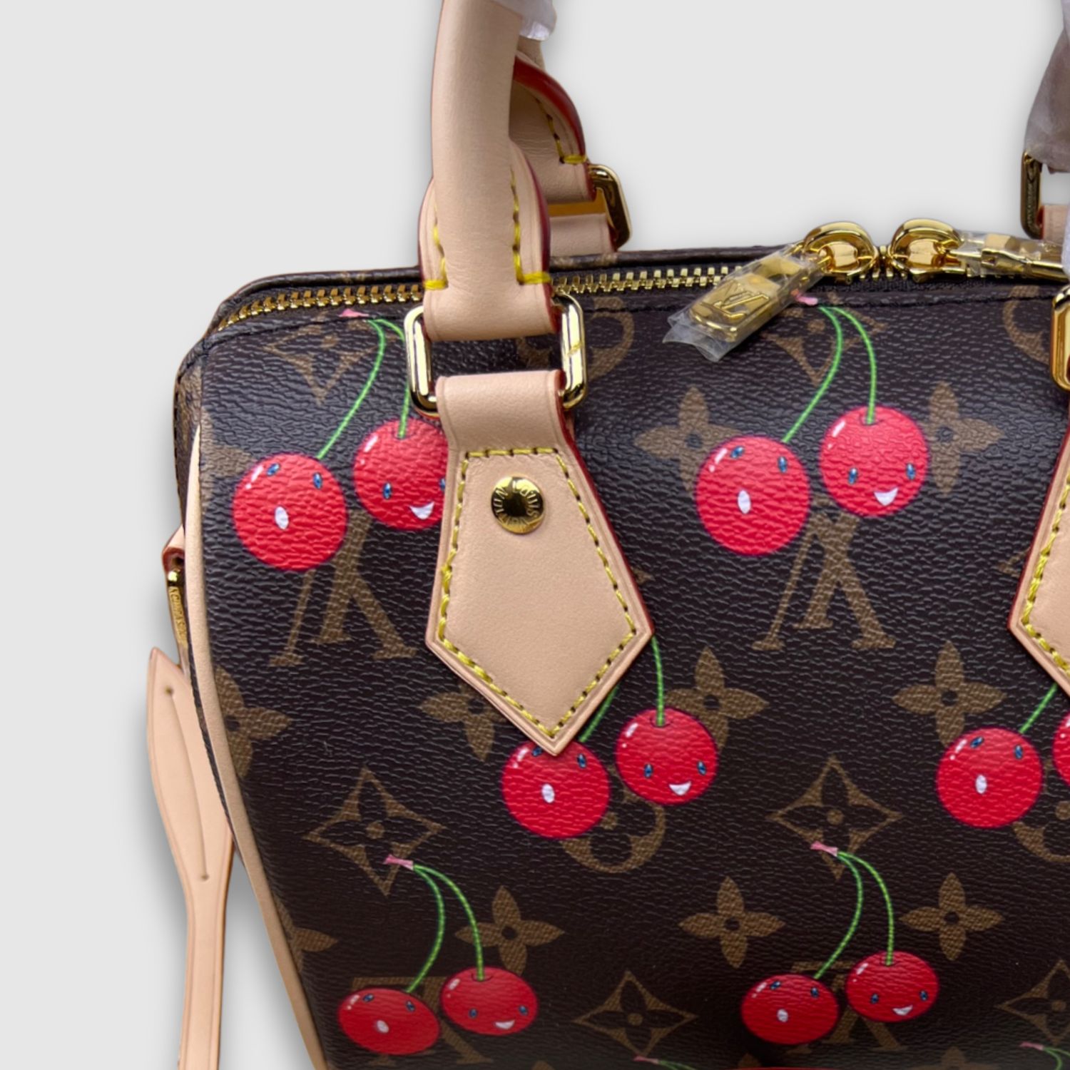 Size: 8.1 x 5.3 x 4.7 inches / 20.5 x 13 x 12 cm (Length x Height x Width)Spirited signatures from the re-edition of the Louis Vuitton x Murakami collection elevate the Speedy Bandoulière with a chic twist. Luscious cherry motifs uplift the House’s iconic Monogram coated canvas with a joyful burst of color, while the removable strap and exclusive LV x TM keybell. It is crafted in bijou proportions to carry daily essentials including a smartphone and long wallet.