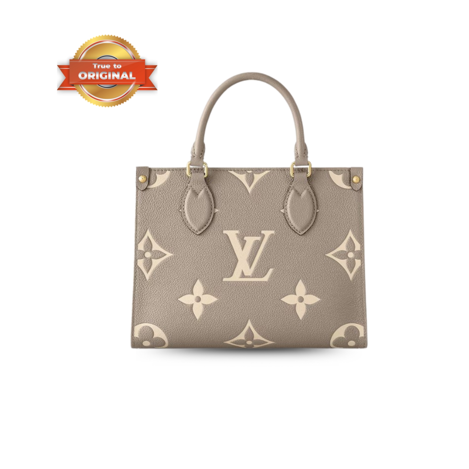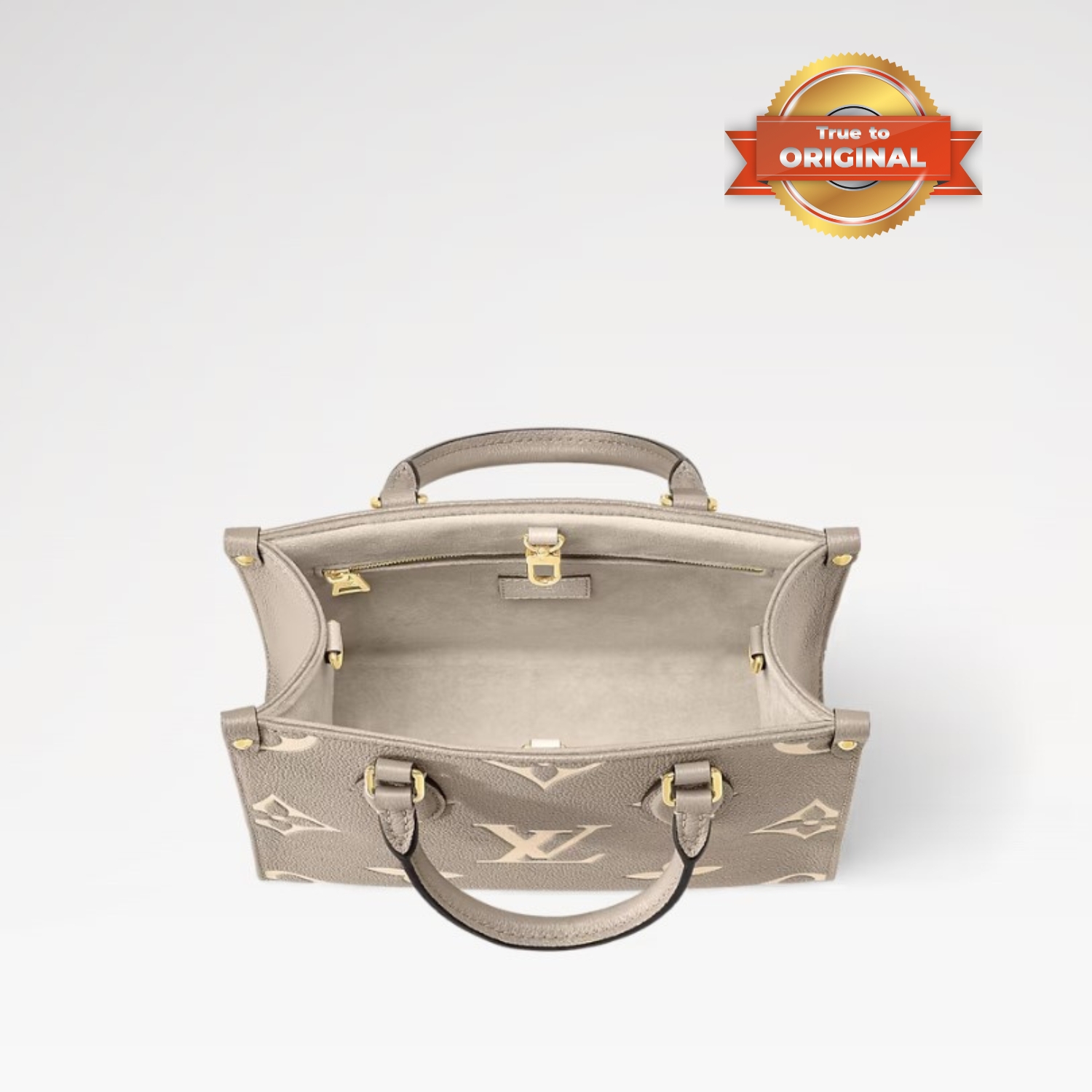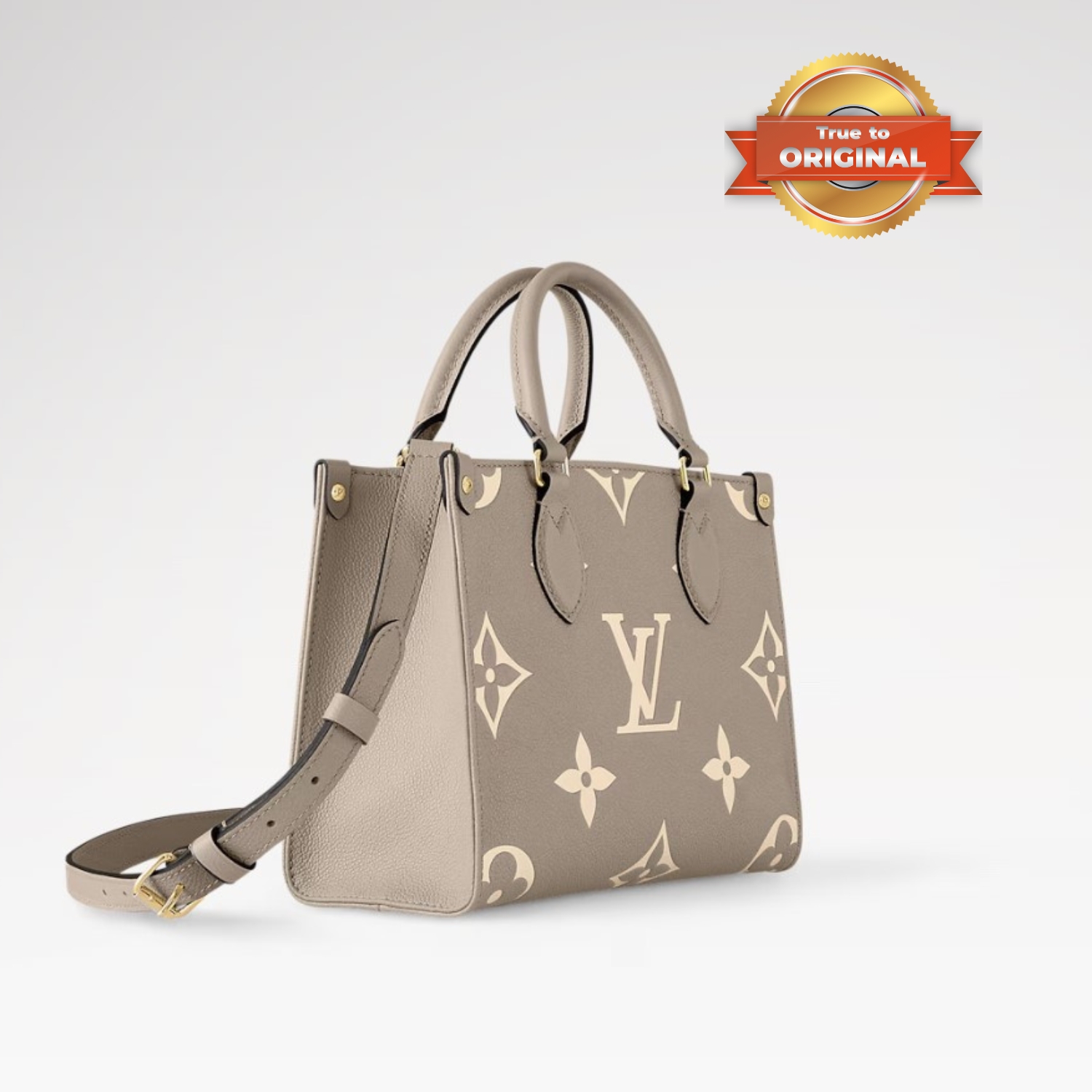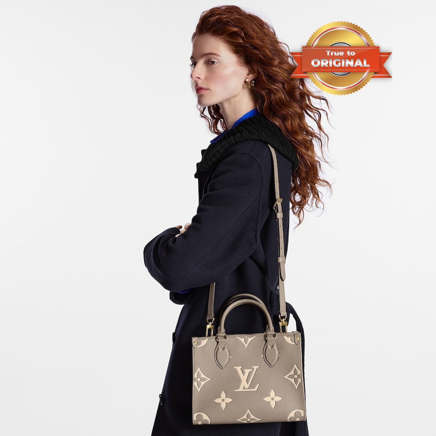 Inspired by Louis Vuitton’s famous Sac Plat from 1968, the OnTheGo PM tote is fashioned in Monogram Empreinte leather, embossed with a Giant Bicolor Monogram pattern. This smaller version of the original Onthego fits essentials such as a mini tablet. Articulated top handles and an adjustable removable strap offer a variety of carry options.