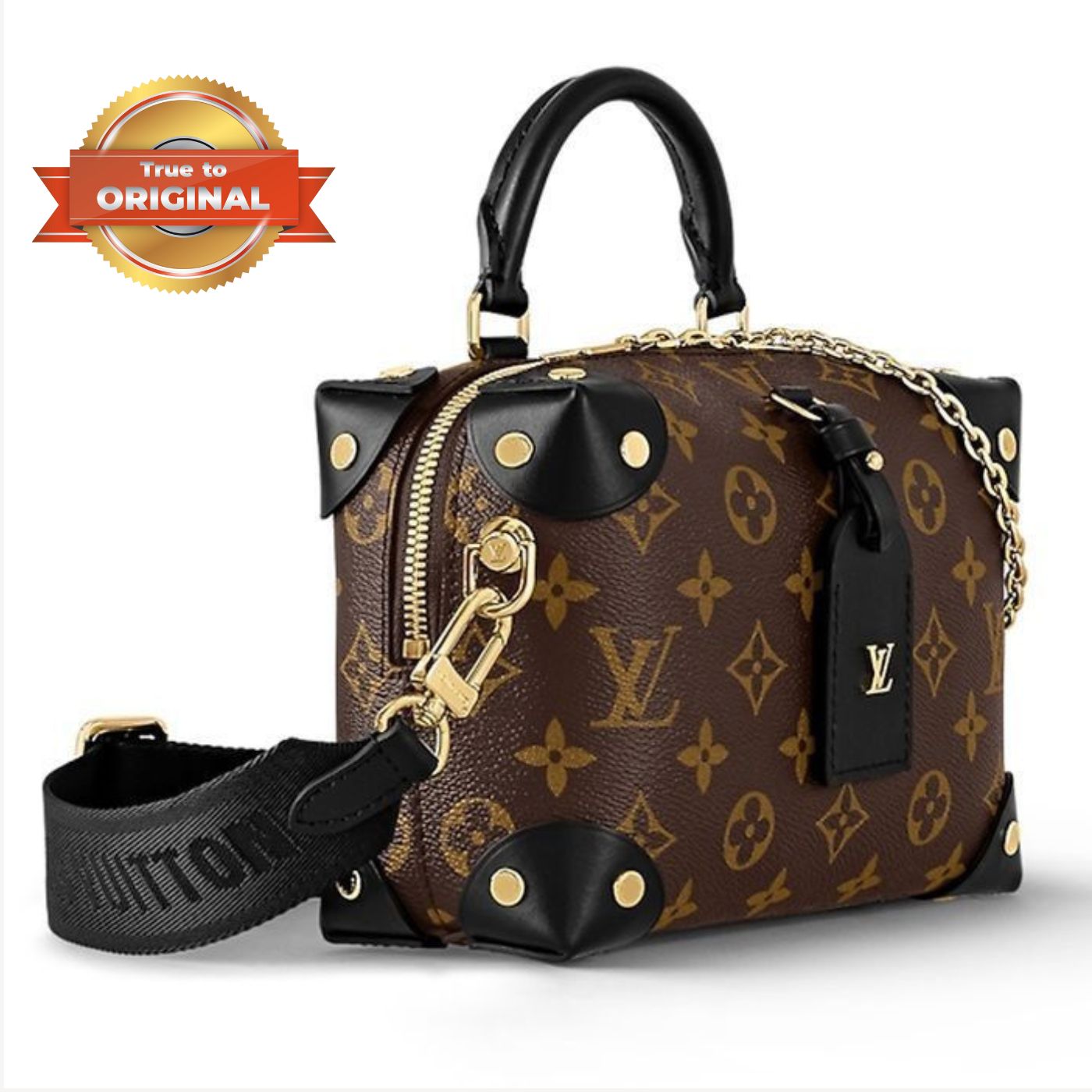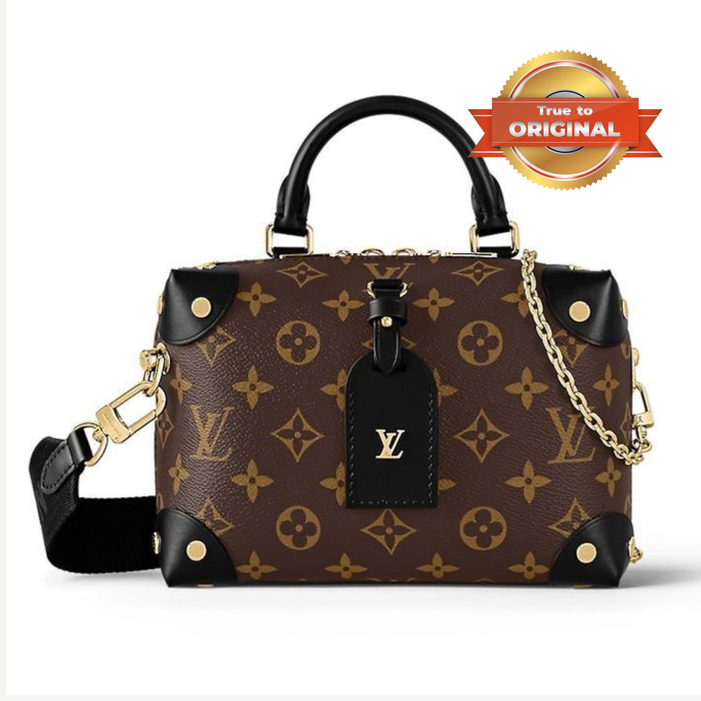 • The distinctive Petite Malle Souple is a soft handbag steeped in the House history. The Monogram canvas, riveted corners, and name tag all evoke Louis Vuitton’s legacy as a trunk maker. A gold-color nautical chain and wide removable strap, with Louis Vuitton Malletier embroidered on it, bring up-to-the-minute style.